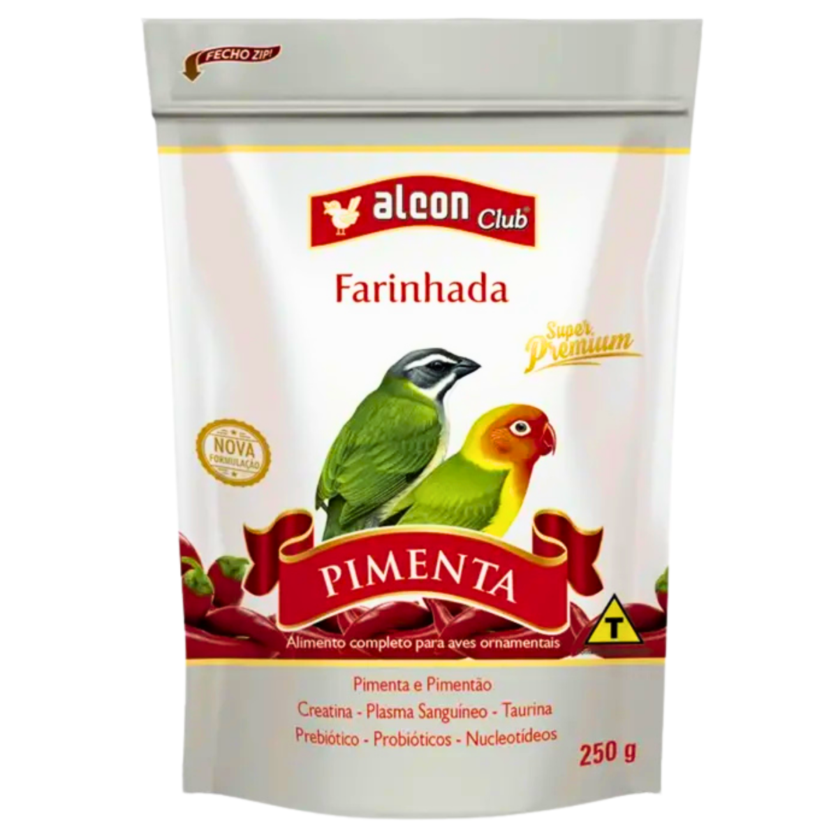 Alcon Club Farinhada Silvestres é um alimento completo para pássaros como Trinca-Ferro, Sabiá, Curió, Bicudo, Azulão, Coleiro, entre outras espécies. Com composição muito variada, é indicado para períodos de maior necessidade nutricional, como na época de reprodução e de muda de penas. Contem diversas frutas cristalizadas e é cuidadosamente enriquecido com Vitamina E, além de fontes de Selênio Orgânico e Ômega 3, ingredientes importantes para o período reprodutivo. Apresenta Creatina e L-Carnitina, que melhoram o metabolismo energético e desempenho das aves. Gemas de ovos desidratadas utilizadas em sua composição garantem a segurança sanitária frente aos riscos de utilização de ovos frescos. Apresenta fonte de nucleotídeos, Prebiótico e Probiótico, que favorecem o desenvolvimento da flora intestinal benéfica, melhorando o aproveitamento dos nutrientes. Saiba como alimentar sua ave durante a muda de penas: Forma de uso: Servir puro ou misturado à ração de manutenção Alcon Eco Club ou Alcon Club, em comedouros limpos. Deixar água limpa sempre à disposição. A farinhada deve corresponder a ¼ da alimentação, servida diariamente nos períodos de reprodução, muda de penas, estresse e recuperação de doenças. Composição básica: Farelo de soja*, creme de milho*, farinha de arroz, farinha de trigo, óleo de soja refinado*, Gammarus desidratado, semente de níger, frutas cristalizadas (4 %), concha de ostra em pó, sacarose, fosfato bicálcico, proteína texturizada de soja*, gema de ovo desidratada, extrato de levedura (fonte de nucleotídeos) (1,29 %), premix vitamínico mineral, cloreto de sódio, leveduras (fonte de selênio orgânico) (0,19 %), aditivo prebiótico (0,18 %), aditivo probiótico (0,12 %), antioxidantes (Etoxiquin, Propilgalato, ácido cítrico, BHA, BHT), creatina (0,08 %), farinha de alga (fonte de DHA - Ômega 3) (0,07 %), vitamina E, aditivo aromatizante (aroma de laranja), L-carnitina (0,02 %). *Espécies doadoras de gene: Agrobacterium tumefaciens, Bacillus thuringiensis, Streptomyces viridochromogenes. Enriquecimento por kg de produto: Vitamina A (21.000 UI); Vitamina D3 (3.500 UI); Vitamina E (500 UI); Vitamina K3 (5,8 mg); Vitamina B1 (4,7 mg); Vitamina B2 (17,5 mg); Vitamina B12 (23,3 mcg); Vitamina B6 (4,7 mg); Pantotenato de cálcio (35 mg); Niacina (81,7 mg); Colina (364 mg); Ácido fólico (1,7 mg); Biotina (0,2 mg); Metionina (583,3 mg); Selênio (3,6 mg); Manganês (46,7 mg); Ferro (58,3 mg); Cobre (5,8 mg); Iodo (1,2 mg); Zinco (58,3 mg); Vitamina C (175 mg) Níveis de Garantia: Umidade (máx.)...........................................100 g/kg (10 %) Proteína bruta (mín.)....................................250 g/kg (25 %) Extrato etéreo (mín.)....................................100 g/kg (10 %) Matéria fibrosa (máx.)..................................60 g/kg (6 %) Matéria mineral (máx.).................................110 g/kg (11 %) Cálcio (máx.)..............................................30 g/kg (3 %) Cálcio (mín.)...............................................17 g/kg (1,7 %) Fósforo (mín.).............................................8.000 mg/kg (0,8 %) Nucleotídeos (mín.)......................................640 mg/kg (0,064 %) Mananoligossacarídeo (mín.)..........................400 mg/kg (0,04 %) Saccharomyces cerevisiae (mín.)....................2,4 x 108 UFC/kg Enterococcus faecium (mín.)..........................1,2 x 107 UFC/kg Lactobacillus acidophilus (mín.)......................1,2 x 107 UFC/kg Creatina......................................................800 mg/kg (0,08 %) DHA - Ômega 3 (mín.)..................................100 mg/kg (0,01 %) L-Carnitina..................................................200 mg (0,02 %) |
