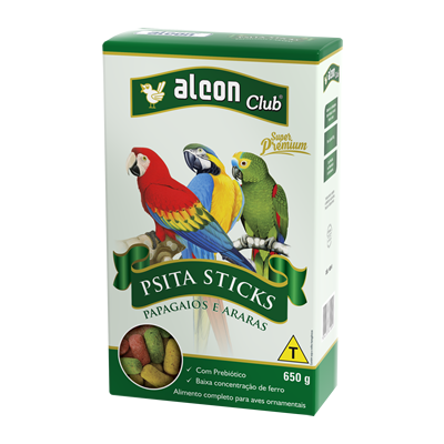 Alcon Club Psita Sticks - Papagaios e Araras é um alimento extrusado completo para Papagaios, Araras e outros psitacídeos médios e grandes. Contém Prebiótico que promove o crescimento seletivo de bactérias benéficas presentes nos intestinos, melhorando o aproveitamento dos nutrientes. A baixa concentração de ferro, importante para estas aves, evita riscos ao bom funcionamento do fígado. Elaborado com ingredientes selecionados, vitaminas e minerais de alta qualidade, apresenta textura e aroma agradáveis. O formato estimula a manipulação pelas aves, reproduzindo a situação encontrada na natureza. Facilita muito o manejo, pois não há necessidade da rotina diária de limpeza das sementes. Deste modo o alimento pode ser fornecido para vários dias.