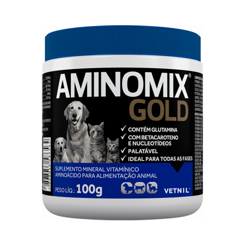 Aminomix Gold possui uma formulação super premium, para melhora da qualidade da alimentação. Fornece doses essenciais de aminoácidos, vitaminas e minerais, além de componentes específicos que favorecem a saúde dos cães, gatos e mustelídeos, com o Betacaroteno, Nucleotídeos e a Glutamina. |