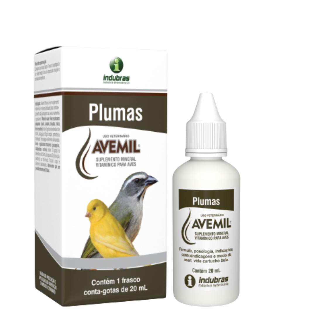 Avemil Plumas é um suplemento mineral e vitamínico utilizado para o embelezamento da plumagem das aves ornamentais e pássaros. Modo de usar: Aves e pássaros pequenos (curió, canário, bicudo, trinca ferro e outros) Diluir 5 gotas no bebedouro de 50ml de água ou 50g de ração, semente ou farinhada. Trocar á água e alimento diariamente. Aves e pássaros maiores (papagaio, calopsita e outros) Diluir 10 gotas no bebedouro de 50ml de água ou 50g de ração, semente ou farinhada. Trocar a água e alimento diariamente. Composição básica: Vitamina A, Vitamina D3, Vitamina B3 (nicotinamida), Vitamina B5 (pantotenato de cálcio), Vitamina B6, Vitamina H (biotina), Sulfato de zinco, ômega 3, 6 e 9 (óleo de canola) e excipientes.