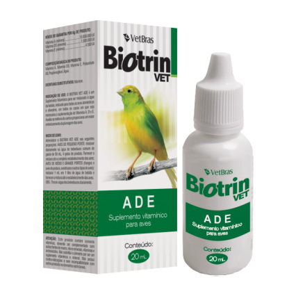 O BIOTRIN VET ADE é um Suplemento Vitamínico para ser misturado à água de bebida, indicado para todas as aves domésticas e silvestres, em todos os casos em que seja necessária a suplementação Vitaminas A, D e E. Auxilia na melhora do canto e proporciona um maior embelezamento da plumagem das aves. |