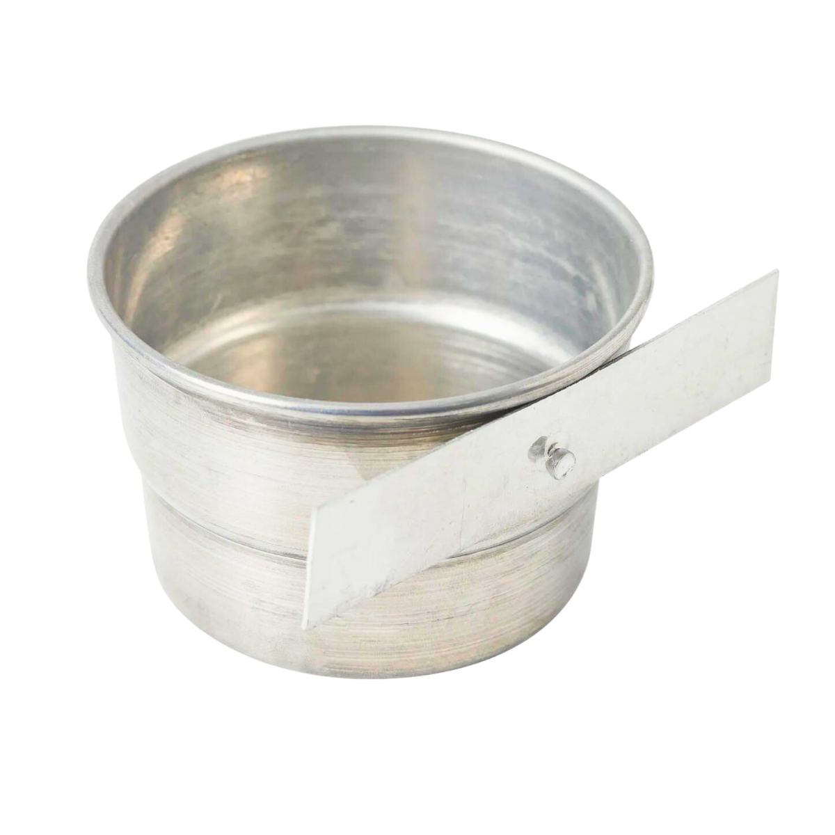 Caneca em alumínio para fornecimento de alimento ou água para os pássaros. |