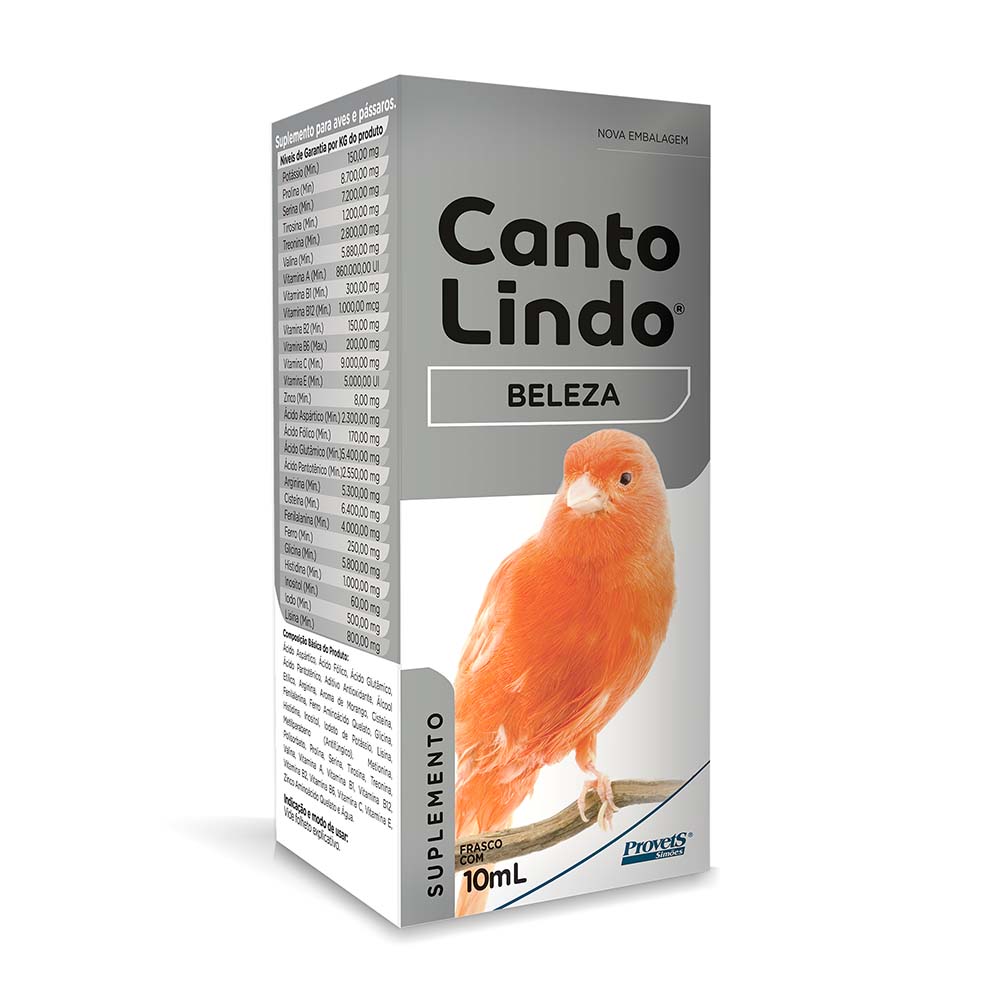 O suplemento alimentar Cantolindo mais Beleza é indicado para aves em período de muda de penas ou que apresentam algum tipo de deficiência no empenamento. É uma mistura de vitaminas, minerais e aminoácidos essenciais para formação de uma pena saudável. Posologia: Agite o produto antes de usar. O produto deve ser utilizado em bebedouros de coloração âmbar, evitando assim a inativação de seus componentes.