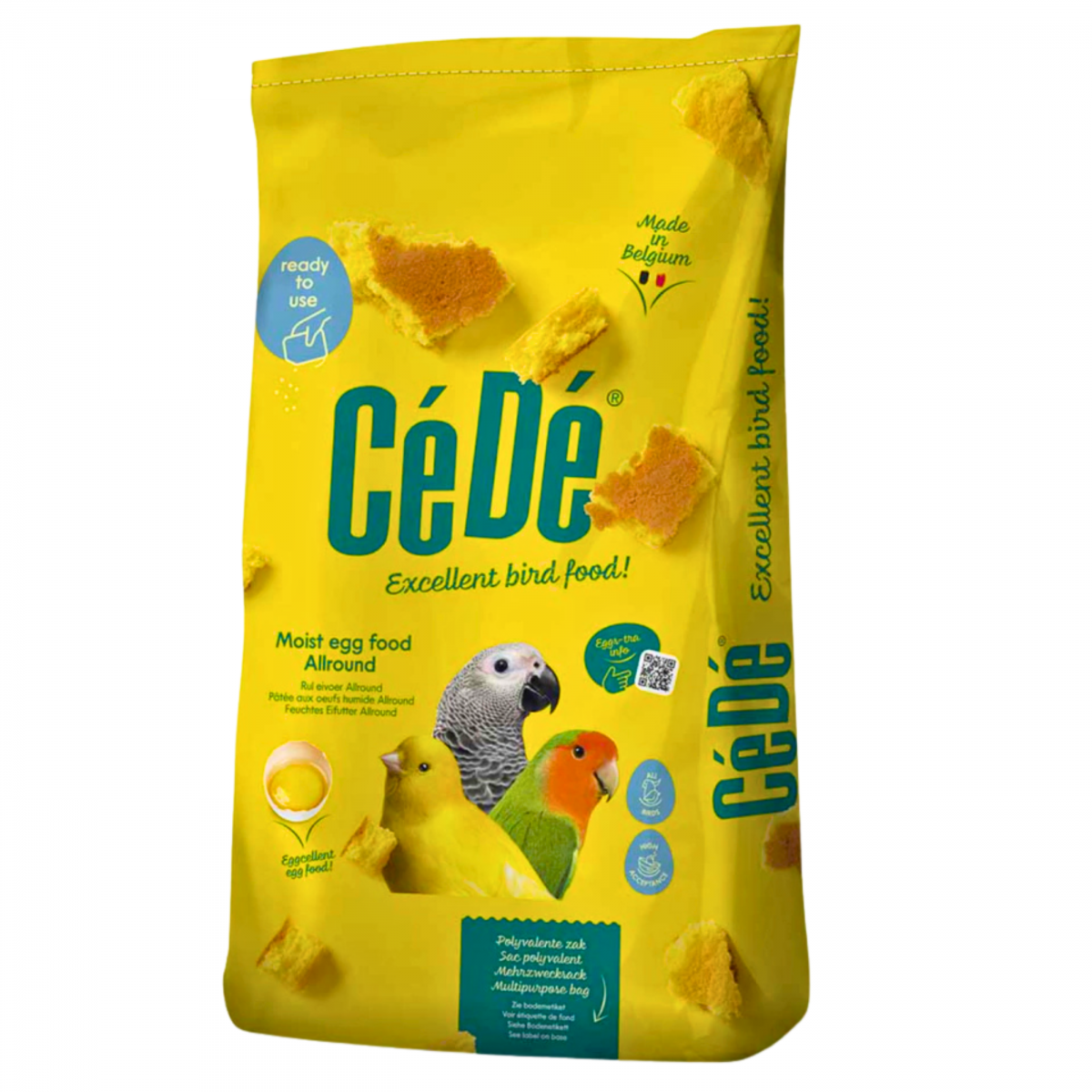 CéDé Premium Eggfood Allround é uma farinhada pronta, à base de ovos, que pode ser oferecida direto do pacote. Utiliza ovos inteiros na composição, o que torna a CéDé única! A proteína do ovo é a fonte ideal de proteína animal para pássaros. E contém qualidade animal premium e proteínas vegetais, além de todas as vitaminas, aminoácidos e minerais necessários para uma criação bem-sucedida. COMPOSIÇÃO Produtos de panificação, ovos, derivados de ovos, óleos e gorduras, extratos de proteínas vegetais, sementes, minerais. CONSTITUINTES ANALÍTICOS