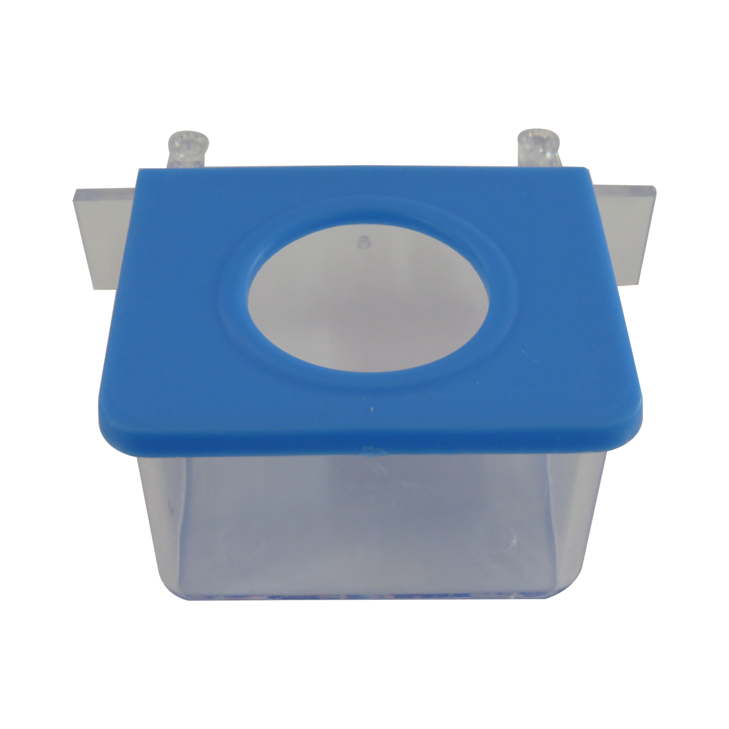 Comedouro 1 furo cristal com gancho. Recomendado para evitar o desperdício de sementes em viveiros e gaiolas.