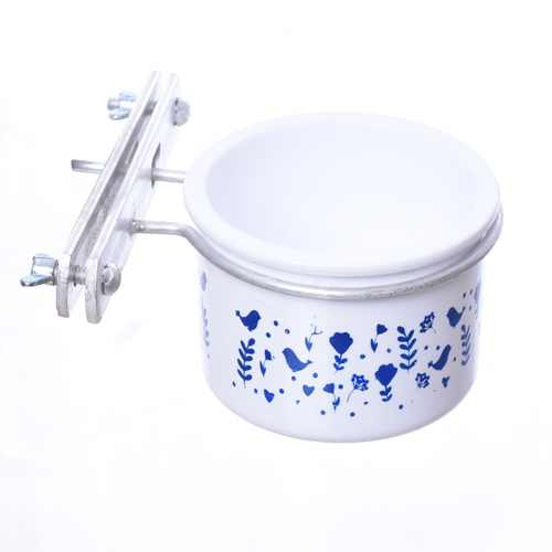 Produto de excelente qualidade, fabricado em plástico e suporte em metal. Utilizado para servir alimentos em gaiolas ou viveiros. Medidas: Altura: 5cm Diâmetro: 6,5cm |