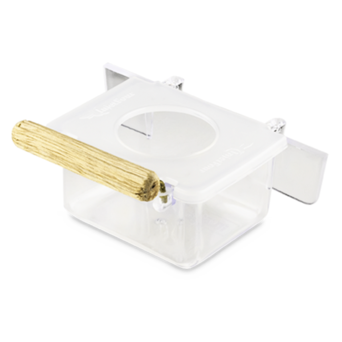 Comedouro para gaiolas de malha fina, na cor natural com poleiro e gancho. |
