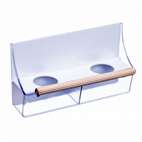 Produto produzido em acrílico, possui poleiro de madeira e uma divisão central. Indicado para viveiros ou gaiolas de pássaros. |