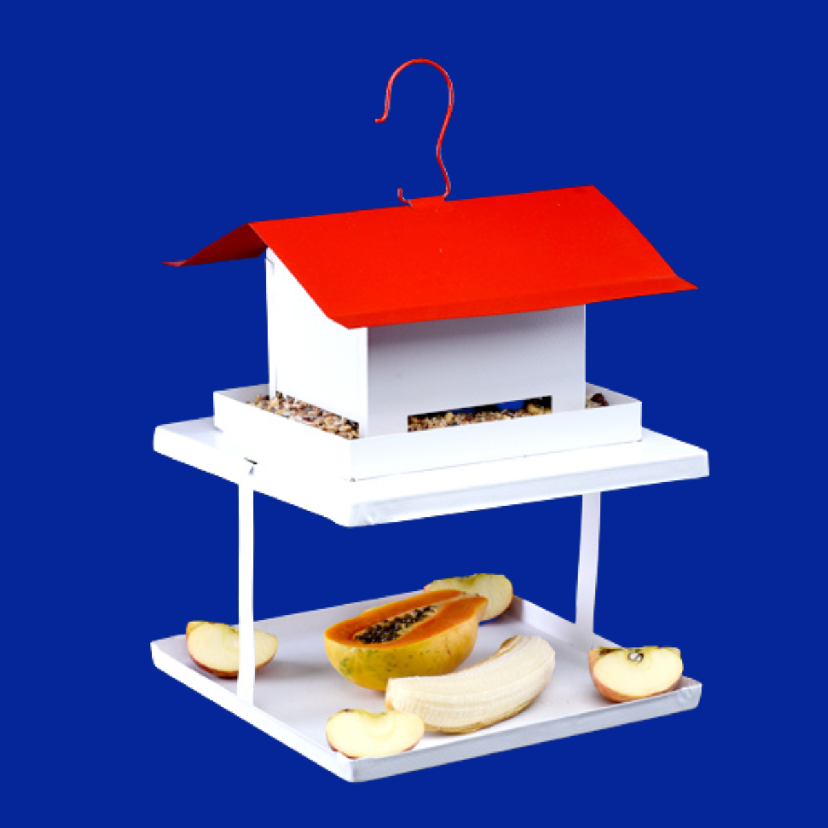 Produzido inteiramente em metal, podendo ser deixado livremente no tempo. Sua utilização é indicada para servir alimentos a pássaros livres, fornecendo sementes, quireras e alimentos secos na parte superior e frutas na parte inferior. Poderá ser utilizado em galhos de árvores, sendo pendurado facilmente. |