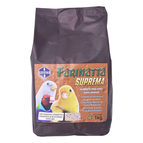 Farinatta Suprema Alimento completo, rico em nutrientes e com sementes, para os períodos de manutenção, muda de penas e reprodução de Canários, Exóticos e Silvestres. Linha Super Premium. A formulação das Farinattas segue um padrão uniforme de qualidade. Todas são preparadas para serem usadas como fonte única de alimentação. Suas propriedades foram amplamente testadas para fornecer todos os elementos necessários para à dieta diária dos passáros para os quais se destina. As Farinattas são suplementadas com pré-bióticos, promotores de crescimento, conversor alimentar e adsorvente de micotoxínas, além de ovos de primeira qualidade, desidratados por um processo que lhes proporciona uma validade de dois anos. Essa suplementação confere às Farinattas uma ação promotora de crescimento, com melhora da eficiência alimentar e da produtividade das aves; estimula o sistema imunológico aumentando a resistência de adultos e filhotes e promove controle da mortalidade inespecífica. Modo de Usar: