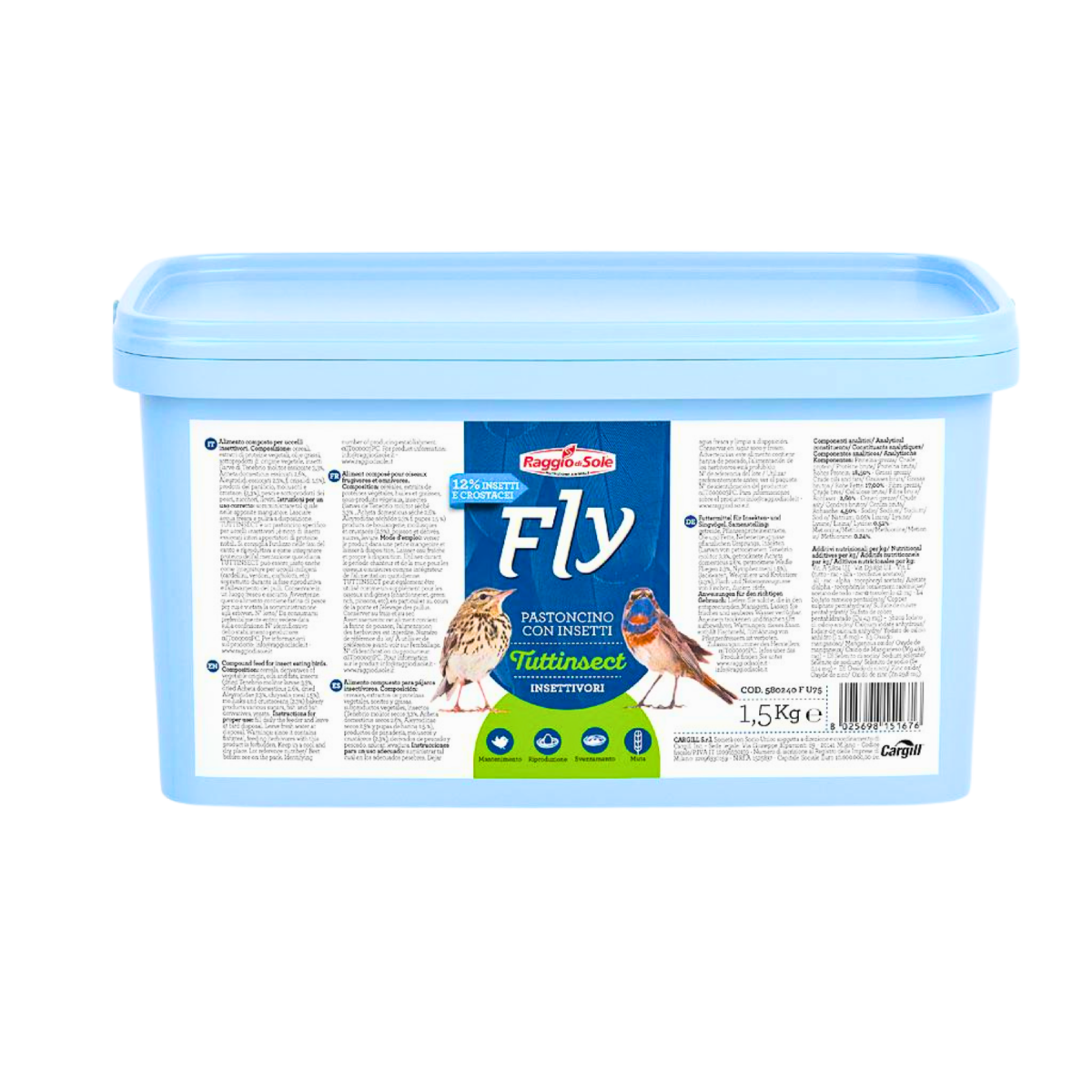 TUTTINSECT da linha Fly Insectivorous da Raggio di Sole é um alimento para aves insetívoras que pode ser utilizado nas fases de canto e reprodução e como suplemento proteico na dieta diária. Com insetos, moluscos e crustáceos 12 ( Tenebrio molitor , Acheta domesticus , Whiteflies, chrysalis, Gammarus ). Fórmula super premium. |