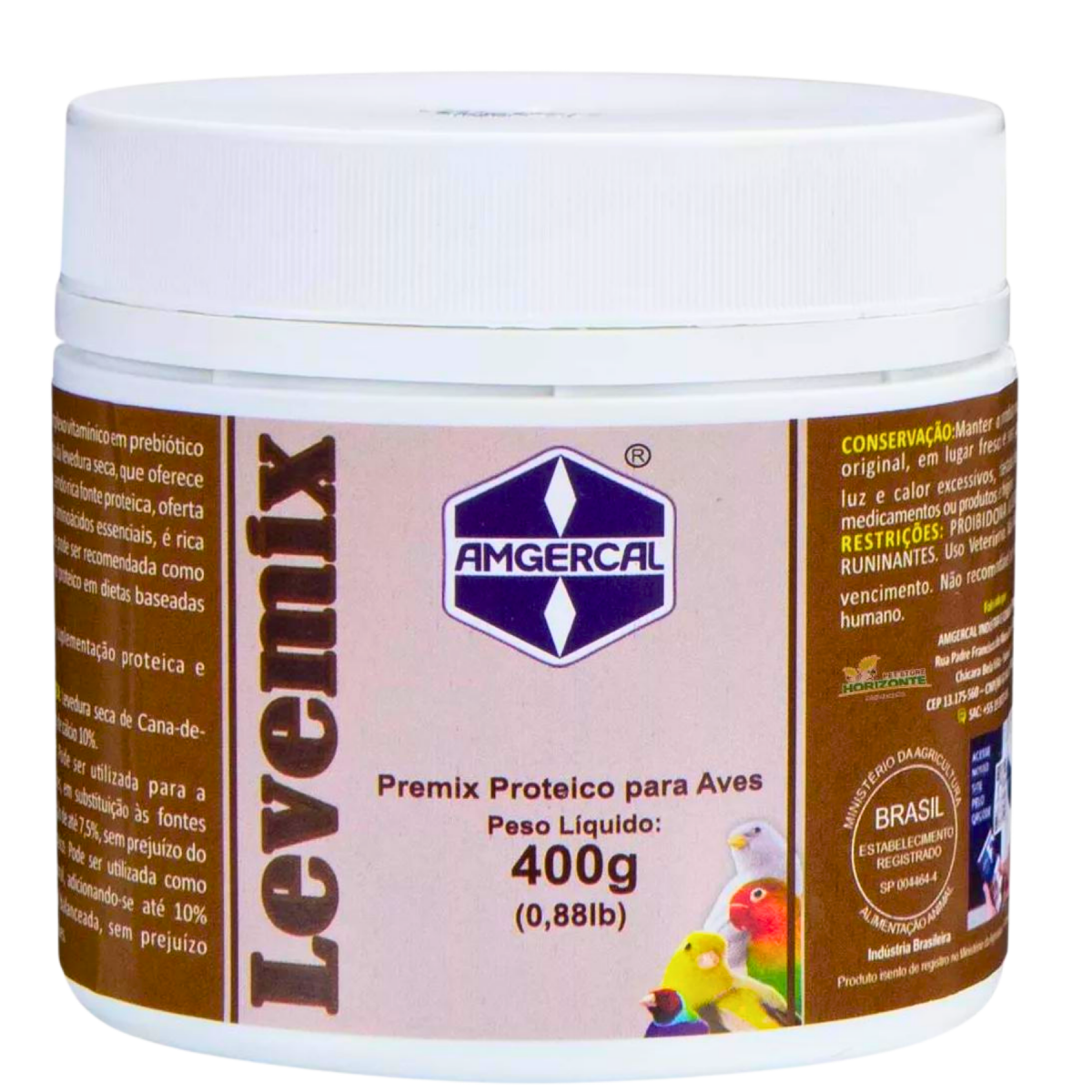 LEVEMIX PREBIÓTICO - AMGERCAL - 400 g - uma solução de premix de proteínas e prebióticos especialmente desenvolvida para complementar a dieta de pássaros que se alimentam de sementes, grãos e cereais. |