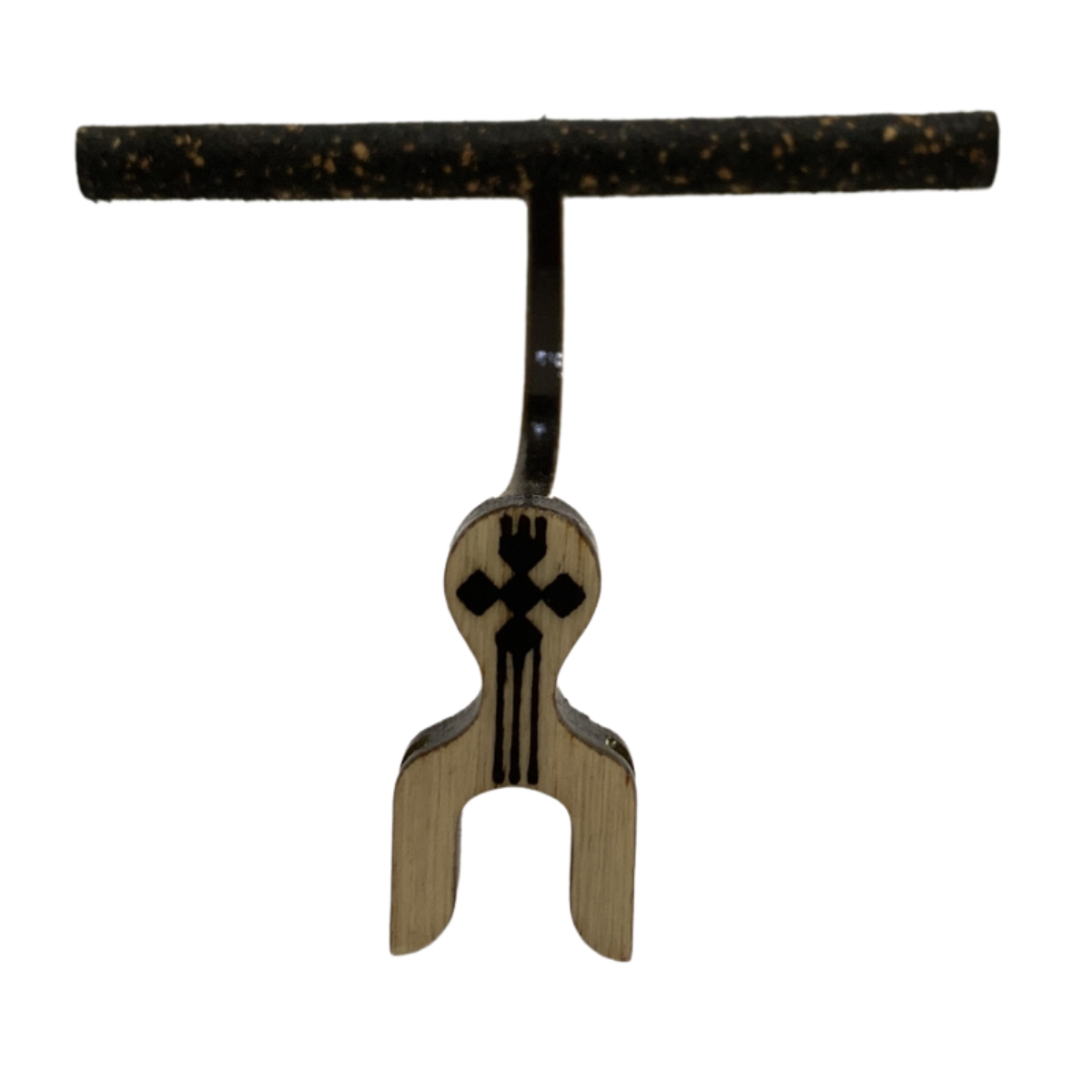 Maritaca lateral pequena em cortiça preta, malha fina, com presilha na cor branca. |