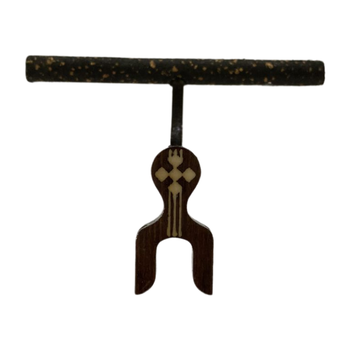 Maritaca lateral pequena em cortiça preta, malha fina, com presilha na cor marrom. |