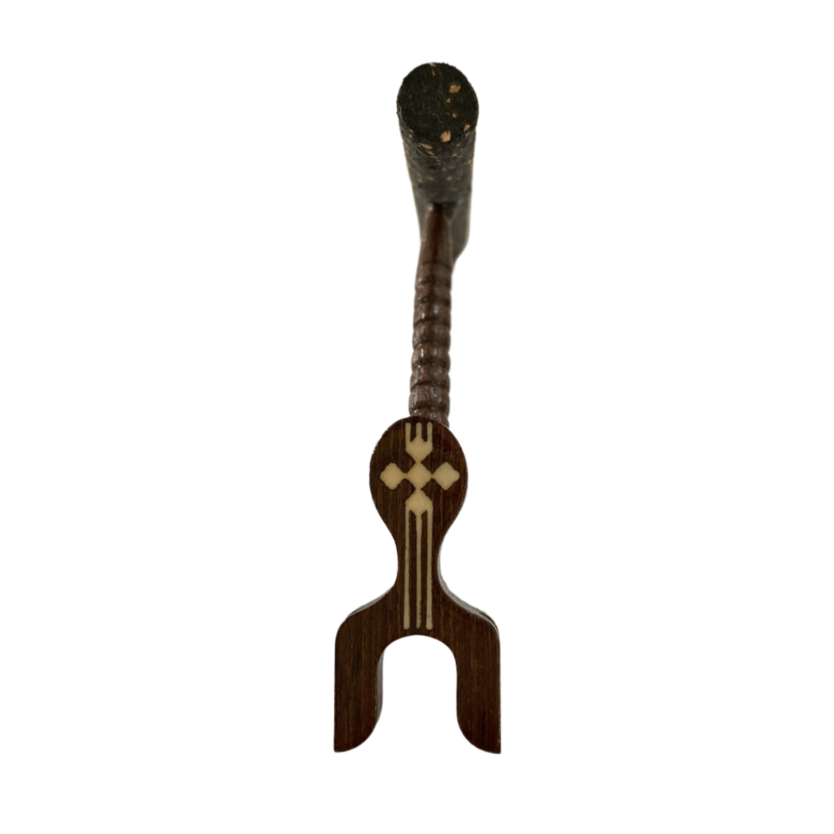 Maritaca torneada grande em cortiça preta, malha fina, com presilha na cor marrom. |