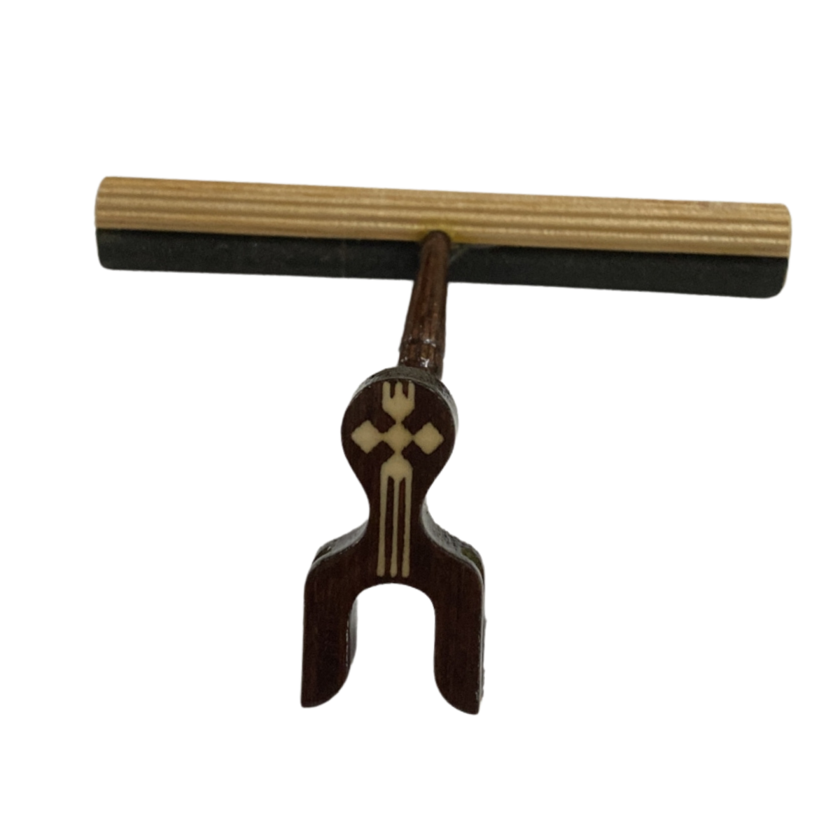 Maritaca torneada lateral pequena estriada natural com lixa, malha fina, com presilha na cor marrom. |