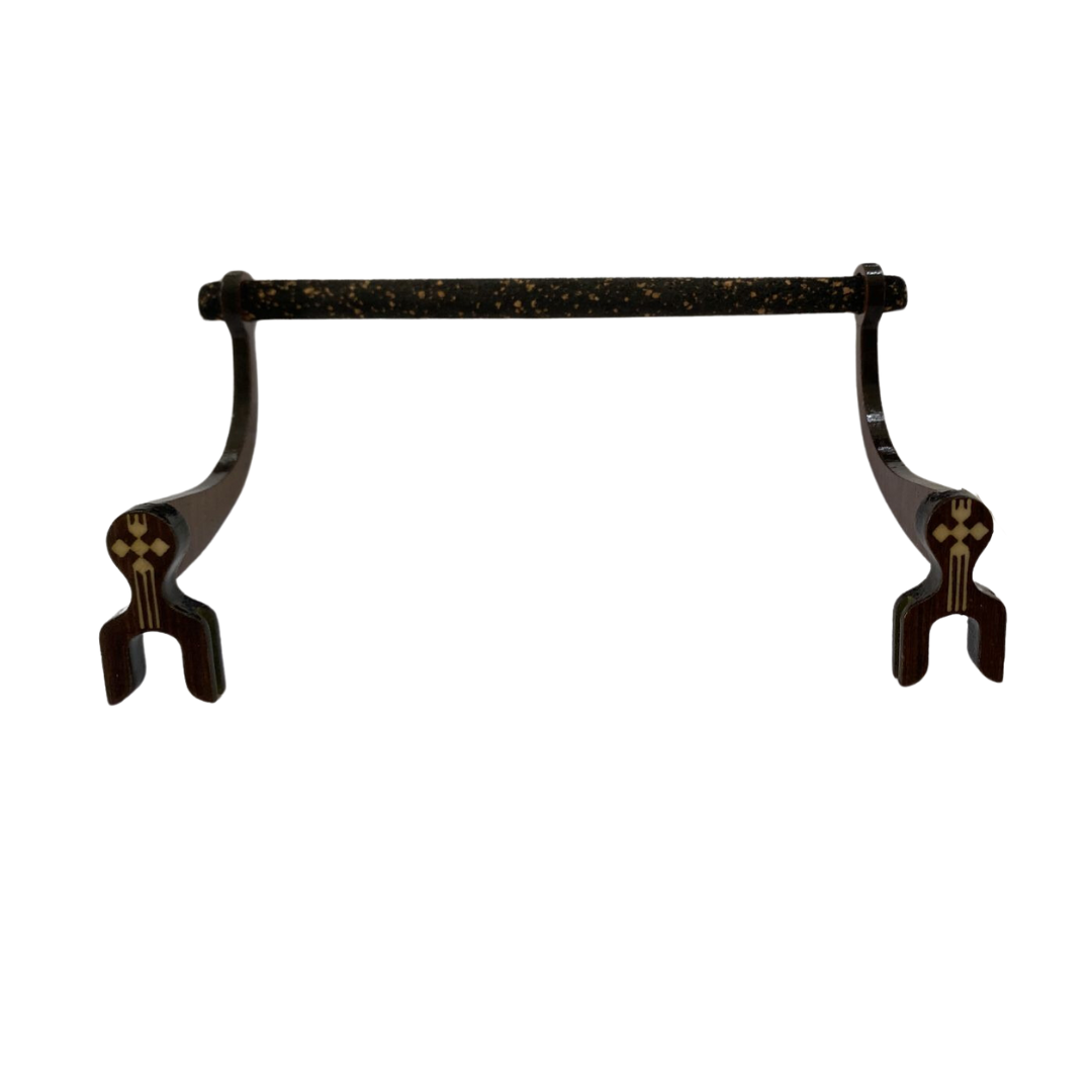 Maritaca trapézio pequena em cortiça preta, malha fina, com presilha na cor marrom. |