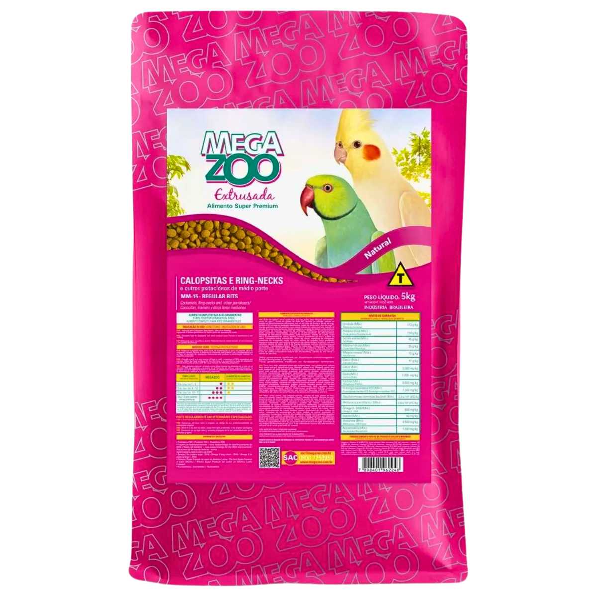 Megazoo MM15 Calopsitas e Ring Necks é um alimento completo para aves ornamentais indicado para calopsitas, maritacas e demais psitacídeos de médio porte em manutenção e muda. Os psitacídeos são aves que podem viver cerca de 60 anos. Porém, sem uma alimentação balanceada, ingerindo somente frutas e sementes, a expectativa de vida diminui devido ao grande desbalanceamento de nutrientes. A filosofia da MEGAZOO é garantir um aporte de nutrientes que favoreça uma vida adequada. Na MEGAZOO CALOPSITAS E MARITACAS o único excesso permitido é a qualidade.