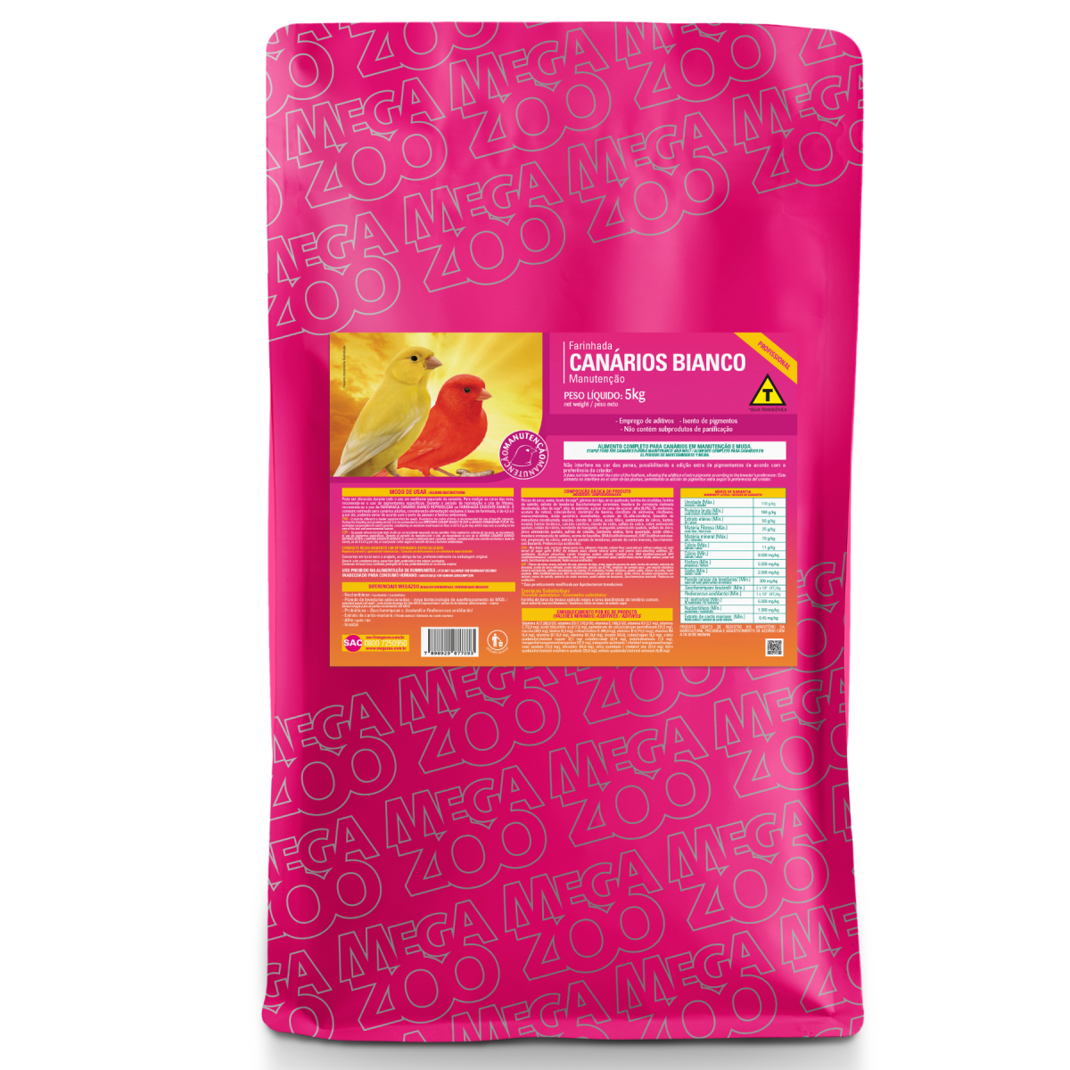 APRESENTAÇÃO: Embalagens metalizadas de 5kg. Alimento completo com todos os ingredientes para suprir as necessidades nutricionais dos canários em manutenção e muda. Não interfere na cor das penas, possibilitando a adição extra de pigmentantes de acordo com a preferência do criador. MODO DE USAR: Pode ser oferecida durante todo o ano em vasilhame separado da semente. Para realçar as cores de suas aves, recomenda-se o uso de realçadores de cor ou pigmentante vermelho, amarelo ou melânico. Durante o período de reprodução e cria de filhotes, recomenda-se o uso da FARINHADA CANÁRIO REPRODUÇÃO. O consumo estimado para canários adultos, considerando alimentação exclusiva à base de farinhada, é de 4,5 a 5 g por dia, podendo variar de acordo com o porte do pássaro e fatores ambientais. COMPOSIÇÃO BÁSICA DO PRODUTO Flocos de arroz, grão de aveia, soja integral extrusada*, farelo de soja*, gérmen de trigo, arroz, insetos desidratados, farinha de salmão, extrato de leveduras (fonte de nucleotídeos), óleo de palmiste, açúcar, fosfato bicálcico, calcário calcítico, levedura seca de cerveja, alho desidratado (0,3%), cloreto de sódio (sal comum), mananoligossacarídeos, probióticos, premix vitamínico mineral aminoácido (aditivos adsorventes de toxinas, extrato de cardo-mariano, DL-metionina, vitamina A, vitamina D3, vitamina B1, vitamina B6, vitamina B2, vitamina B12, vitamina C, vitamina E, vitamina K3, niacina, cloreto de colina, ácido fólico, pantotenato de cálcio, biotina, inositol, zinco aminoácido quelato, sulfato de cobre, cobre aminoácido quelato, iodato de cálcio, monóxido de manganês, manganês aminoácido quelato, sulfato de zinco, sulfato de cobalto), ferro quelatado, aditivo fungistático, levedura enriquecida de selênio, ácido cítrico, aroma de baunilha, aditivo antioxidante (BHA). * Soja geneticamente modificada por Agrobacterium tumefaciens. INGREDIENTES FIXOS SEM EVENTUAIS SUBSTITUTIVOS NÍVEIS DE GARANTIA Umidade (Máx.) 110 g/kg Proteína bruta (Mín.) 160 g/kg Extrato etéreo (Mín.) 48 g/kg Matéria fibrosa (Máx.) 25 g/kg Matéria mineral (Máx.) 60 g/kg Cálcio (Máx.) 12 g/kg Cálcio (Mín.) 9.000 mg/kg Sódio (Mín.) 2.000 mg/kg Fósforo (Mín.) 5.000 mg/kg Saccharomyces cerevisiae (Mín.) 1,6 x 10^5 UFC/kg Enterococcus faecium (Mín.) 8,0 x 10^3 UFC/kg Lactobacillus acidophilus (Mín.) 8,0 x 10^3 UFC/kg Mananoligossacarídeos-MOS (Mín.) 400 mg/kg Beta-glucanas (Mín.) 440 mg/kg Aditivos adsorventes de toxinas (Mín.) 900 mg/kg Extrato de cardo-mariano (Mín.) 0,45 mg/kg ENRIQUECIMENTO POR KG DE PRODUTO (VALORES MÍNIMOS) Vitamina A (7.200,00 UI), vitamina D3 (1.170,00 UI), vitamina E (108,00 UI), vitamina K3 (2,70 mg), vitamina C (72,00 mg), ácido fólico (1,80 mg), pantotenato de cálcio (31,50 mg), cloreto de colina (1.350,00 mg), vitamina B6 (5,40 mg), vitamina B1 (5,40 mg), vitamina B2 (9,00 mg), vitamina B12 (72,00 µg), niacina (49,50 mg), biotina (0,27 mg), inositol (54,00 mg), cobre (6,30 mg), cobre quelatado (2,70 mg), cobalto (0,14 mg), iodo (1,00 mg), ferro quelatado (25,50 mg), manganês (31,50 mg), manganês quelatado (13,50 mg), zinco (54,00 mg), zinco quelatado (27,00 mg), selênio orgânico (0,30 mg). DIFERENCIAIS MEGAZOO - Minerais quelatados - Mananoligossacarídeos-MOS - Probióticos (Saccharomyces cerevisiae, Enterococcus faecium, Lactobacillus acidophilus) - Aditivos adsorventes de toxinas - Extrato de cardo-mariano - Inositol - Alho desidratado |
