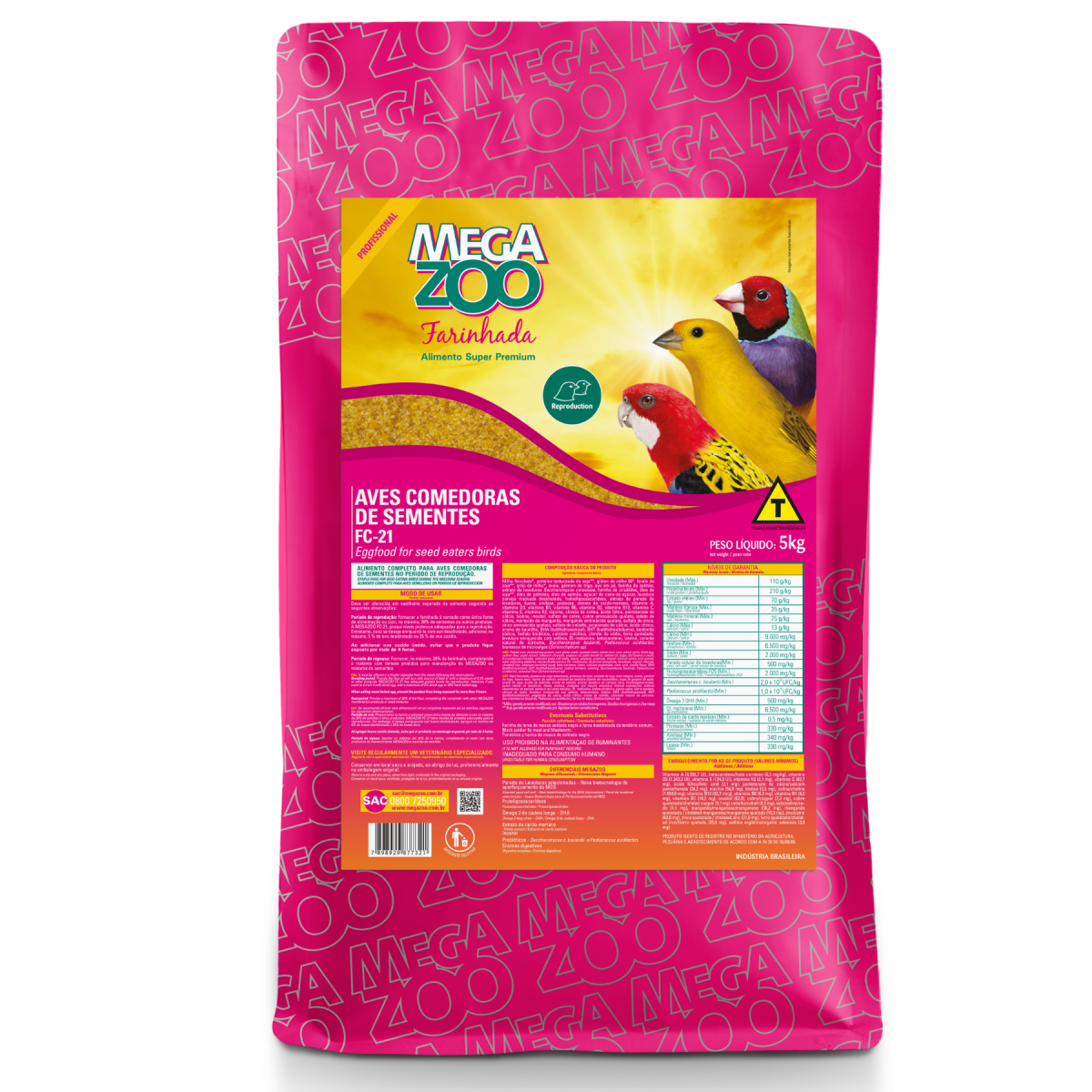 Deve ser oferecida em vasilhame separado da semente seguindo as seguintes observações: Período de reprodução e cria: Fornecer a farinhada à vontade como única fonte de alimentação ou com, no máximo, 30% de sementes ou outros produtos. A MEGAZOO FARINHADA PARA PÁSSAROS COMEDORES DE SEMENTES REPRODUÇÃO (FC21) possui níveis proteicos adequados para a reprodução, entretanto, caso se deseje enriquecê-la com ovo desidratado, adicionar, no máximo, 5 % de ovo desidratado ou 25 % de ovo cozido. Ao adicionar ovo cozido úmido, evitar que o produto fique exposto por mais de 4 horas. Período de repouso: Fornecer no máximo, 30% da farinhada, completando o restante com demais produtos para manutenção da MEGAZOO ou misturas de sementes.