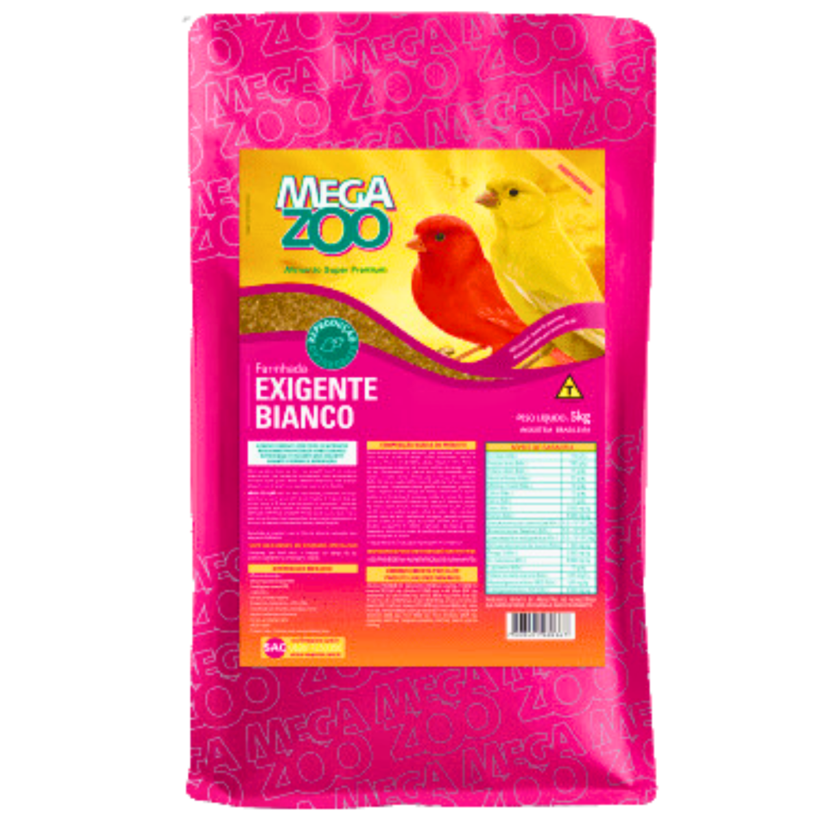 Deve ser oferecida à vontade, juntamente com outros alimentos, ou como única fonte de alimentação. O consumo deve ser iniciado cerca de 30 dias antes do período de reprodução e encerrado apenas no final deste período. Os filhotes devem ser alimentados com MEGAZOO FARINHADA EXIGENTE BIANCO até 60 dias de idade, mesmo após saírem do ninho. Após esse período devem gradualmente passar a se alimentar da MEGAZOO FARINHADA BIANCO MANUTENÇÃO.
