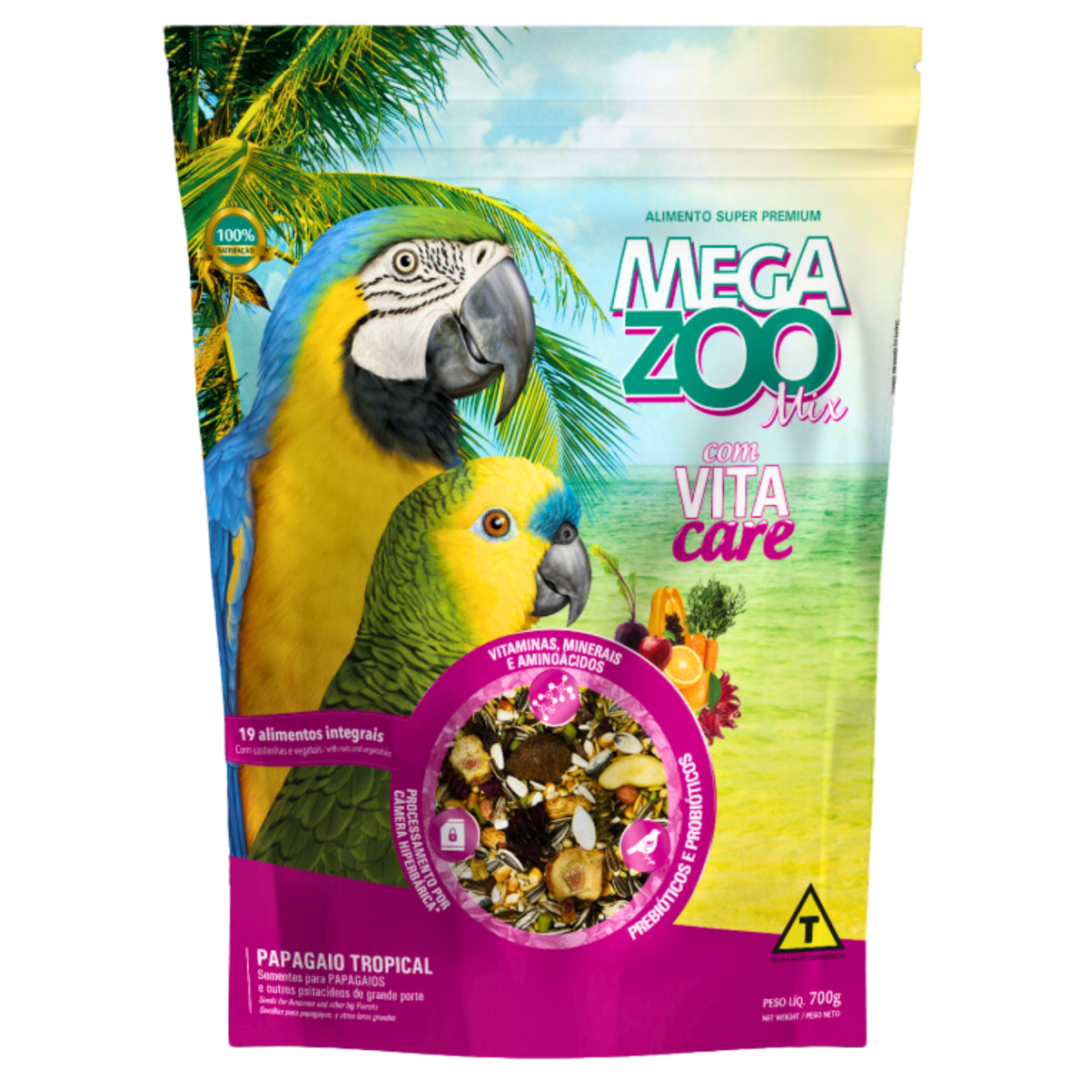 Semente de girassol, cártamo, semente de girassol branco, grão de milho*, grão de soja torrado*, ervilha, grão de aveia, semente de abóbora, amendoim com casca, grão de amendoim, frutas e legumes desidratados ? 14% (mamão, laranja, maçã, uva passa, cenoura, beterraba, alfarroba, flor de hibiscos, pimenta, castanha do Pará com casca), castanha do Pará sem casca, aditivo flavorizante, macarrão, 6 % de alimento extrusado Megazoo contendo: milho integral moído, farelo de soja, óleo de soja, fosfato bicálcico, calcário calcítico, cloreto de sódio (sal comum), aditivo fungistático, mananoligossacarídeos, premix vitamínico mineral aminoácido (aditivos adsorventes de toxinas, extrato de cardo-mariano, aditivo antioxidante, DL-metionina, vitamina A, vitamina D3, vitamina B1, vitamina B6, vitamina B2, vitamina B12, vitamina C, vitamina E, vitamina K3, niacina, cloreto de colina, ácido fólico, pantotenato de cálcio, biotina, inositol, zinco aminoácido quelato, sulfato de cobre, cobre aminoácido quelato, iodato de cálcio, monóxido de manganês, manganês aminoácido quelato, sulfato de zinco, sulfato de cobalto), L-lisina, DL-metionina, probióticos, corante, ferro quelatado, levedura enriquecida de selênio, sucralose, aditivo antioxidante (BHA).