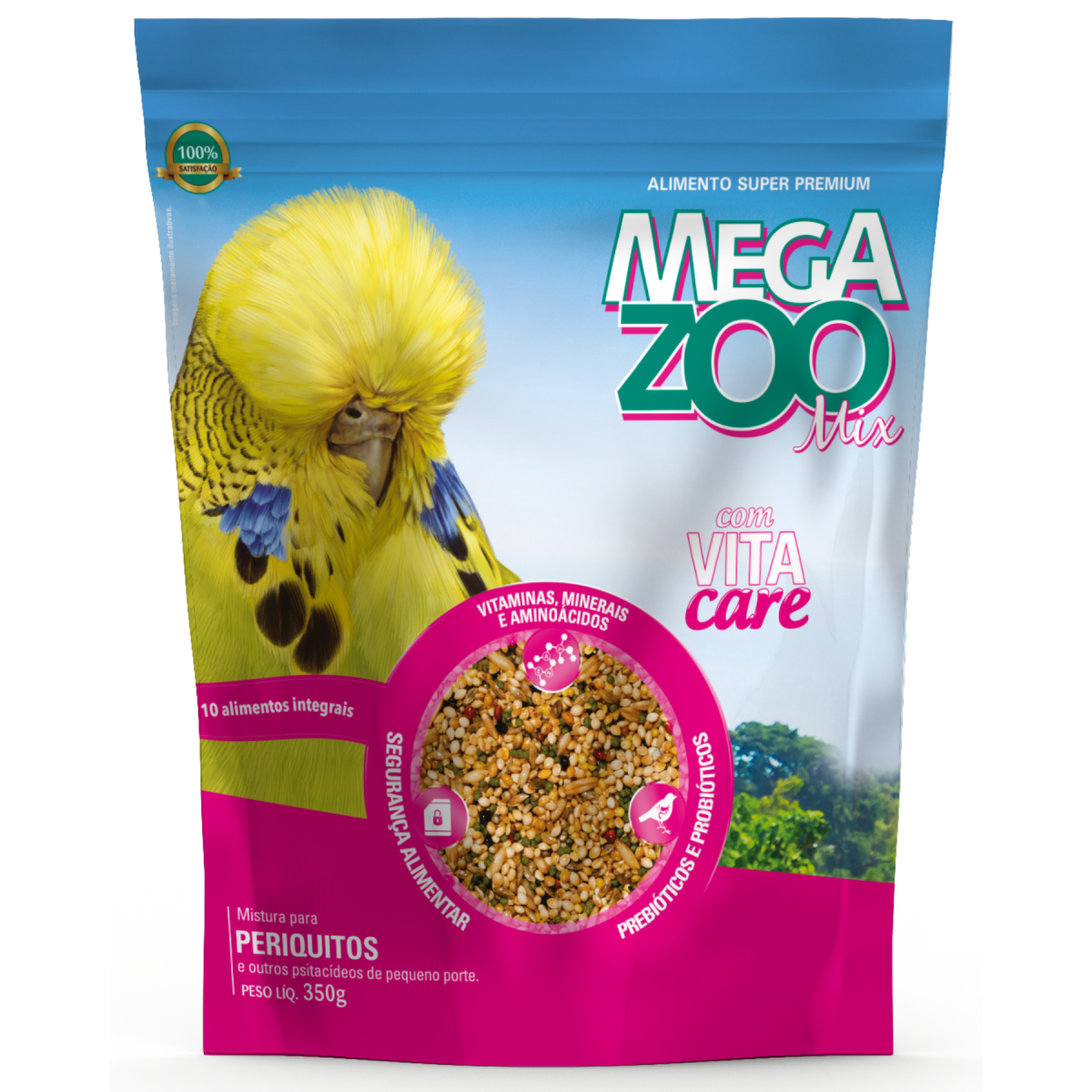 COMPOSIÇÃO BÁSICA DO PRODUTO Grão de painço, grão de alpiste, milheto, grão de aveia, painço preto, painço vermelho, semente de girassol, semente de cártamo, trigo mourisco, aditivo flavorizante, 5 % de alimento extrusado Megazoo contendo: milho integral moído, farelo de soja, óleo de soja, fosfato bicálcico, calcário calcítico, cloreto de sódio (sal comum), aditivo fungistático, mananoligossacarídeos, beta-glucanas, premix vitamínico mineral aminoácido (aditivos adsorventes de toxinas, extrato de cardo-mariano, aditivo antioxidante, DL-metionina, vitamina A, vitamina D3, vitamina B1, vitamina B6, vitamina B2, vitamina B12, vitamina C, vitamina E, vitamina K3, niacina, cloreto de colina, ácido fólico, pantotenato de cálcio, biotina, inositol, zinco aminoácido quelato, sulfato de cobre, cobre aminoácido quelato, iodato de cálcio, monóxido de manganês, manganês aminoácido quelato, sulfato de zinco, sulfato de cobalto), L-lisina, DL-metionina, corante, ferro quelatado, levedura enriquecida de selênio, sucralose, aditivo antioxidante (BHA).
