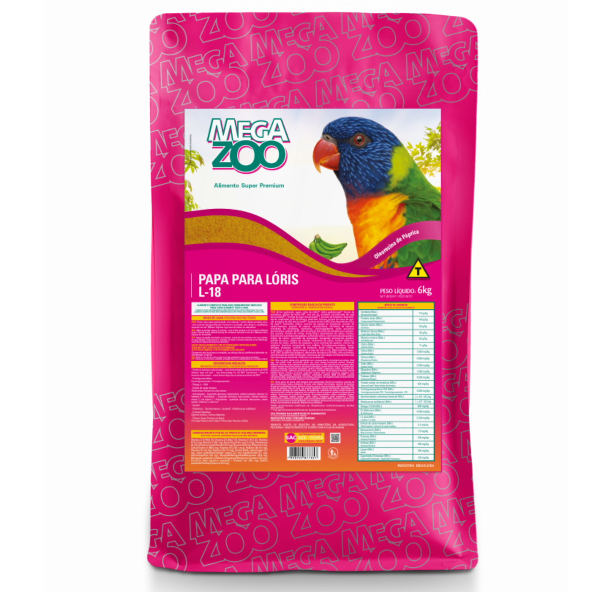 Uma singularidade dos Lóris é que eles são essencialmente frugívoros e nectarinos. Em cativeiro, é importante que se forneça alimentos pastosos e líquidos especialmente formulados. A MEGAZOO PAPA PARA LÓRIS foi elaborada de modo a se manter estável por várias horas após misturada à água, sem escurecimento, sem mudança de sabor e sem decantação dos ingredientes. A MEGAZOO PAPA PARA LÓRIS apresenta ingredientes nobres para melhor digestibilidade. MODO DE USAR Fazer uma papa misturando, em volume, 1 parte desse produto para 1,5 a 2 partes de água filtrada. Fornecer à vontade, duas vezes ao dia, sem deixar o vasilhame exposto ao sol. Manter higiene rigorosa de todos os utensílios.