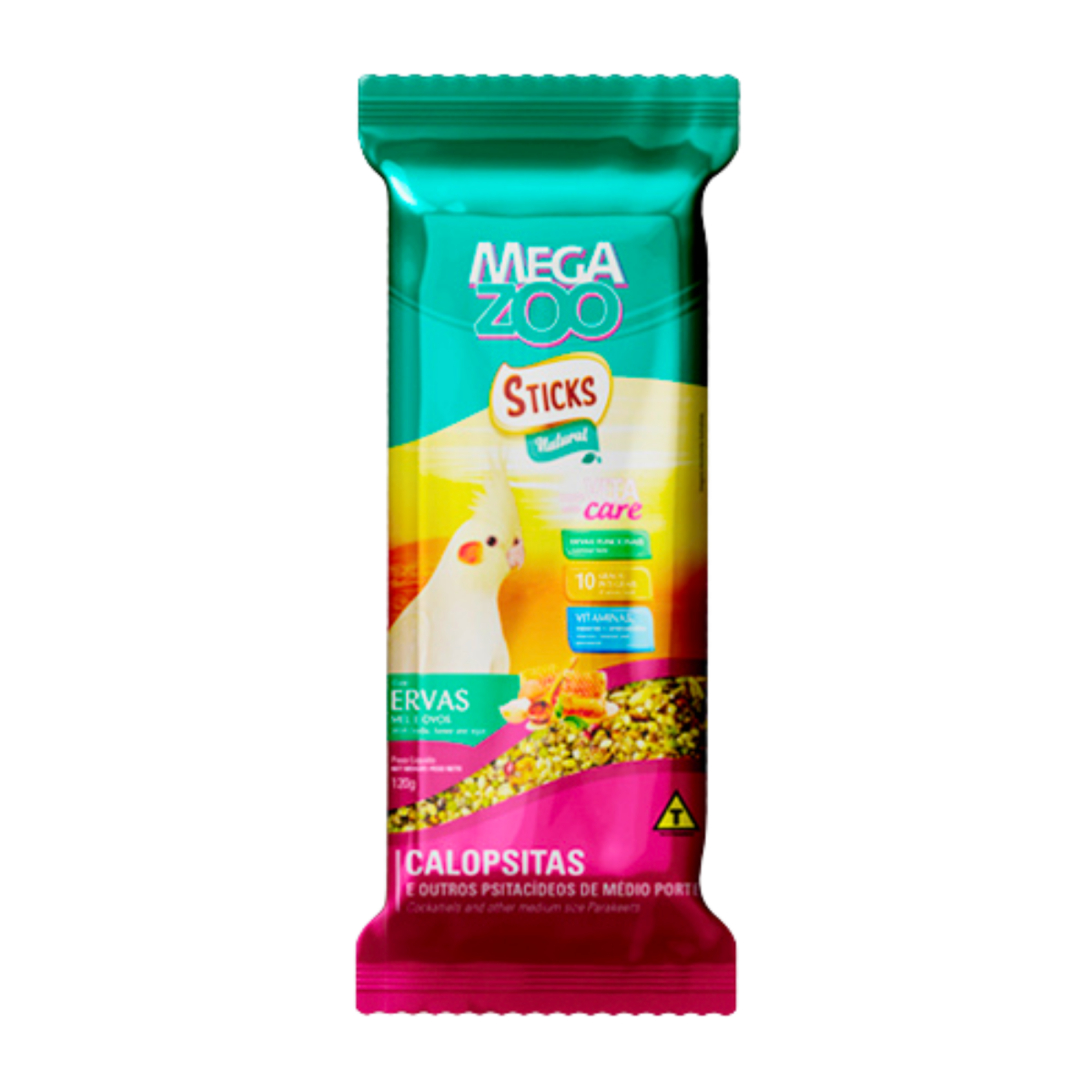 Grão de alpiste, grão de painço, painço preto, painço vermelho, arroz cateto, aveia, cártamo, linhaça, trigo mourisco, pimenta rosa, 8 % de ervas (anis estrelado, gengibre, tomilho, hortelã, funcho e alecrim), amido de milho*, gelatina, ovo (1%), mel (1,5%), farinhada Megazoo Psitacídeos, 6% de VITACARE contendo: milho integral moído, farelo de soja, farelo de trigo, óleo de soja, óleo de coco, fosfato bicálcico, calcário calcítico, cloreto de sódio (sal comum), mananoligossacarídeos, premix vitamínico mineral aminoácido (aditivos adsorventes de toxinas, extrato de cardo-mariano, aditivo antioxidante, DL-metionina, vitamina A, vitamina D3, vitamina B1, vitamina B6, vitamina B2, vitamina B12, vitamina C, vitamina E, vitamina K3, niacina, cloreto de colina, ácido fólico, pantotenato de cálcio, biotina, inositol, zinco aminoácido quelato, sulfato de cobre, cobre aminoácido quelato, iodato de cálcio, monóxido de manganês, manganês aminoácido quelato, sulfato de zinco, sulfato de cobalto), L-lisina, corante, ferro quelatado, levedura enriquecida de selênio, probióticos, sucralose, antioxidante natural de extrato de alecrim, aditivo antioxidante (BHA).