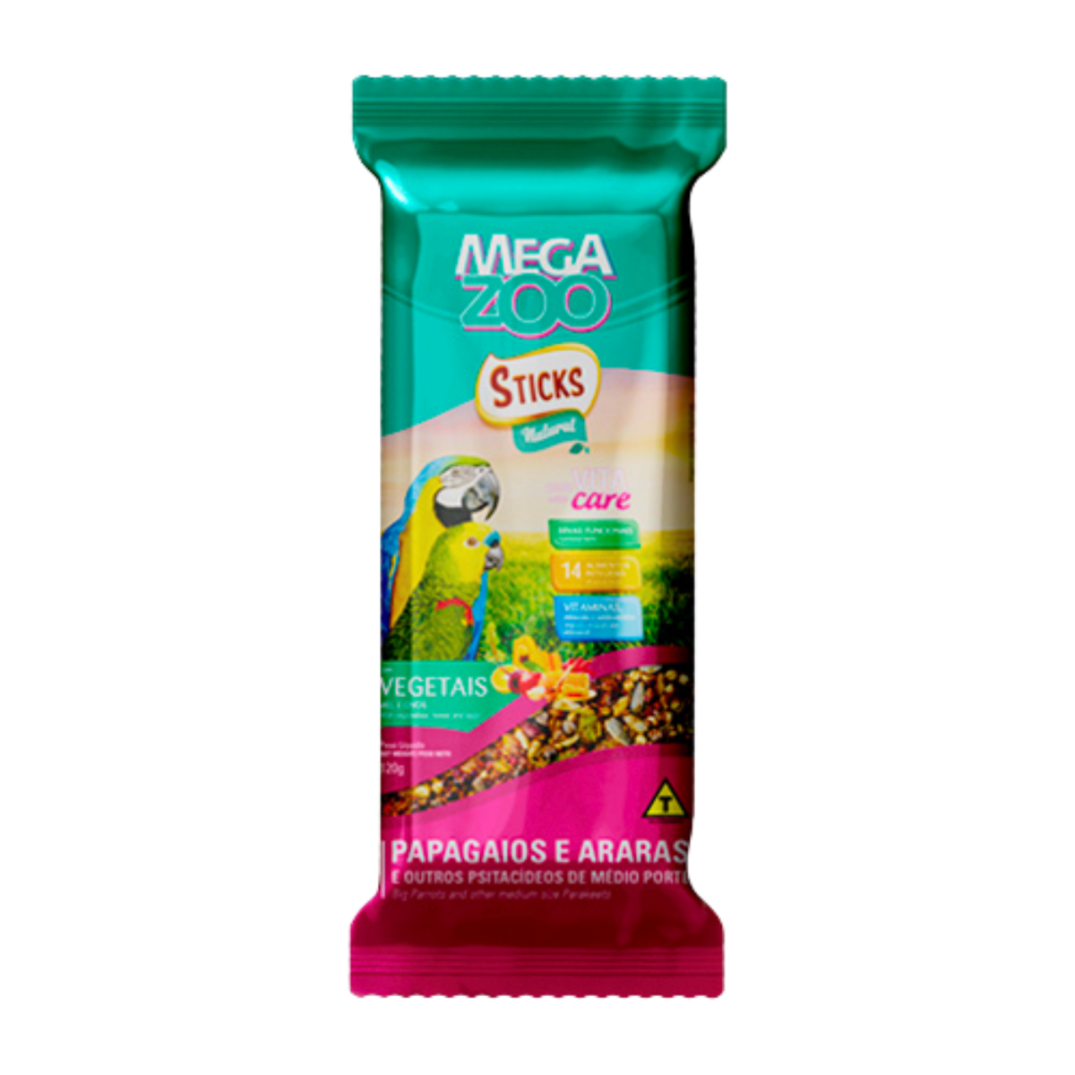 Semente de girassol, sorgo, trigo mourisco, cártamo, ervilha, aveia, arroz, soja*, amendoim, 5% de ervas (funcho, alecrim), 9% de vegetais desidratados (maça, cenoura, beterraba), amido de milho*, gelatina, maltodextrina, ovo (1%), mel (1,5%), farinhada Megazoo Psitacídeos, 6% de VITACARE contendo: milho integral moído, farelo de soja, farelo de trigo, óleo de soja, óleo de coco, fosfato bicálcico, calcário calcítico, cloreto de sódio (sal comum), mananoligossacarídeos, premix vitamínico mineral aminoácido (aditivos adsorventes de toxinas, extrato de cardo-mariano, aditivo antioxidante, DL-metionina, vitamina A, vitamina D3, vitamina B1, vitamina B6, vitamina B2, vitamina B12, vitamina C, vitamina E, vitamina K3, niacina, cloreto de colina, ácido fólico, pantotenato de cálcio, biotina, inositol, zinco aminoácido quelato, sulfato de cobre, cobre aminoácido quelato, iodato de cálcio, monóxido de manganês, manganês aminoácido quelato, sulfato de zinco, sulfato de cobalto), L-lisina, corante, ferro quelatado, levedura enriquecida de selênio, probióticos, sucralose, aditivo antioxidante (BHA).