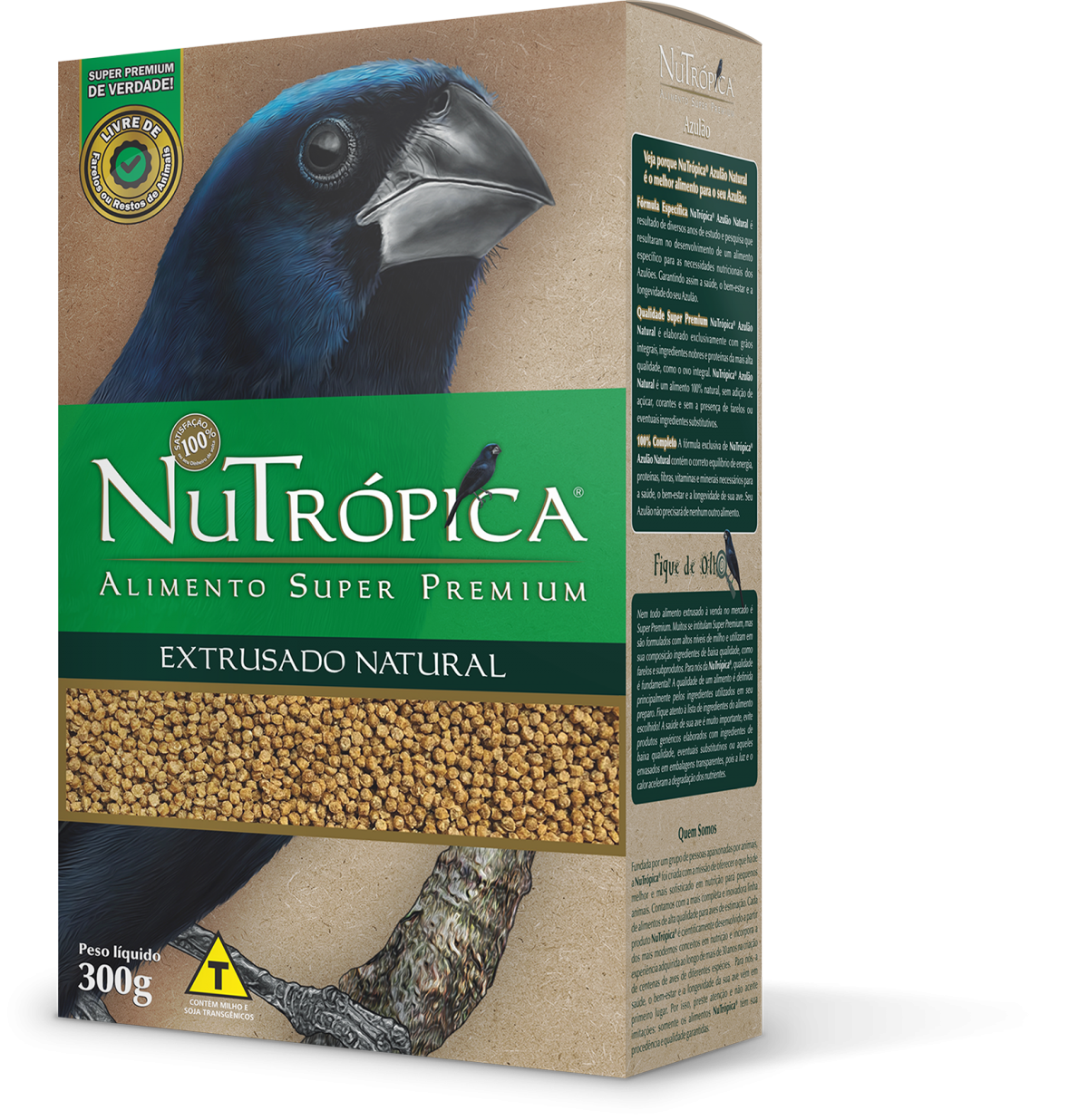 NuTrópica Azulão Natural é um alimento extrusado completo, cientificamente formulado e especialmente desenvolvido para os Azulões. Elaborado a partir de recentes estudos em nutrição, NuTrópica Azulão Natural contém uma exclusiva combinação dos mais nobres ingredientes integrais como arroz, aveia, cevada, linhaça, milho, trigo e soja, que juntos, na quantidade ideal, garantem o perfeito equilíbrio entre energia, proteínas, fibras, vitaminas e minerais. NuTrópica Azulão Natural é um alimento 100% natural, sem a adição de açúcar, corantes ou aromatizantes artificiais, e inclui em sua composição todos os nutrientes necessários para que seu Azulão tenha uma vida longa e saudável.