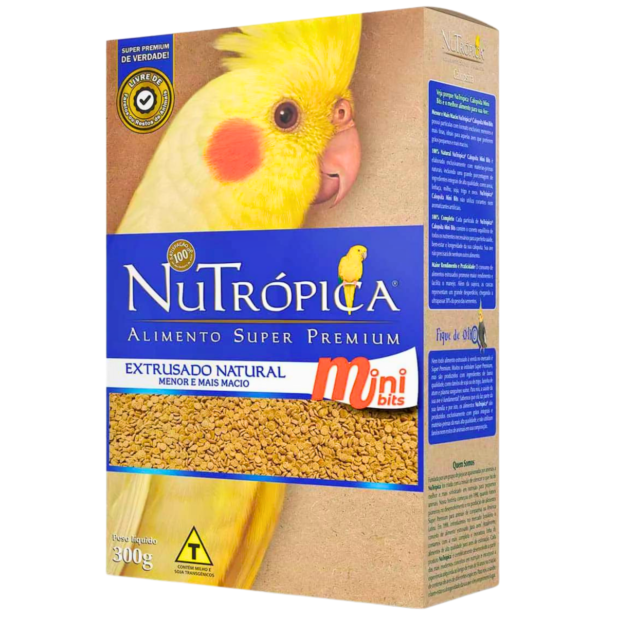 Cada embalagem de NuTrópica® Calopsita Natural Mini Bits contém uma combinação exclusiva dos mais nobres ingredientes integrais como aveia, linhaça, milho, soja, trigo e ovos, que juntos, proporcionam à sua ave uma alimentação saudável e equilibrada. NuTrópica® Calopsita Natural Mini Bits é um alimento completo e inclui em sua composição todos os nutrientes necessários para que sua calopsita tenha uma vida longa e saudável.