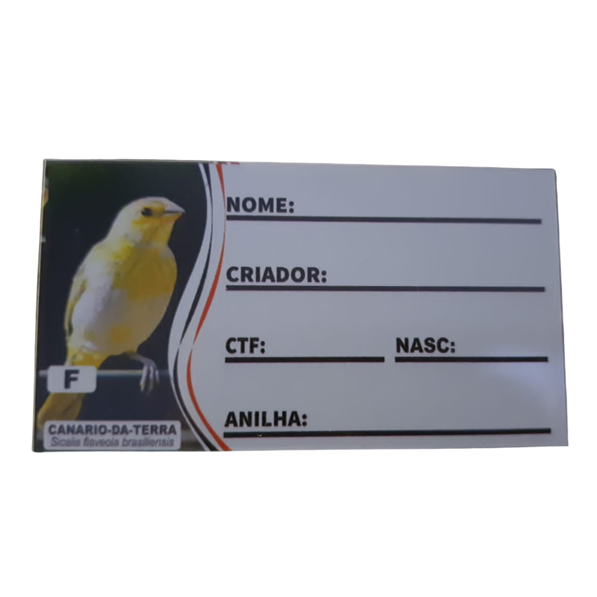 Placa de identificação em pvc para Canário da Terra Fêmea, com presilha na parte traseira da placa para fixação na gaiola. |