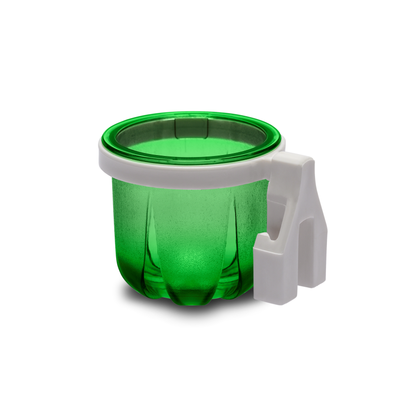 Porta Vitaminas Rubi médio verde com presilha branca.