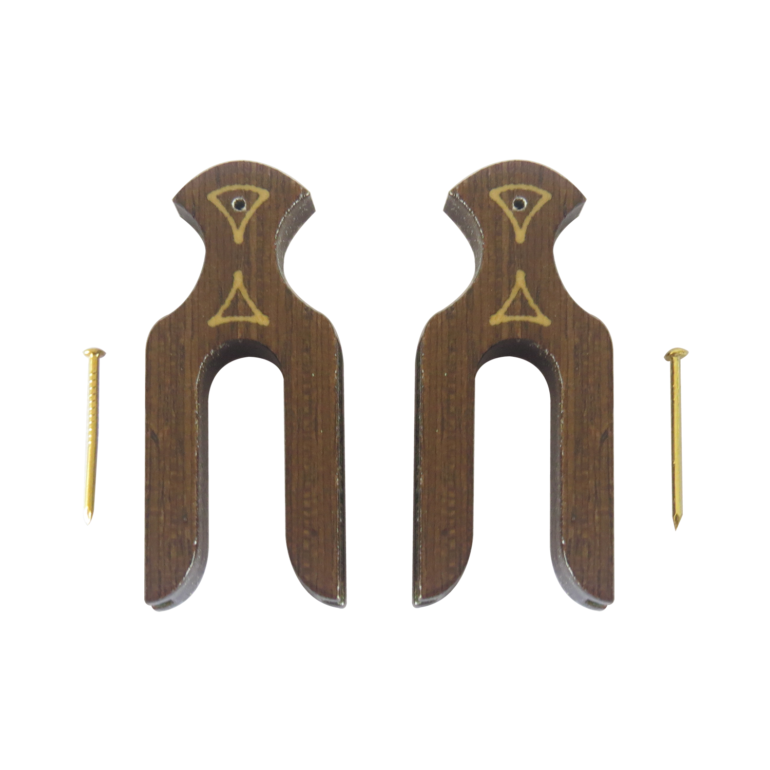 Par de presilhas na cor marrom, com prego para fixação de um poleiro. |