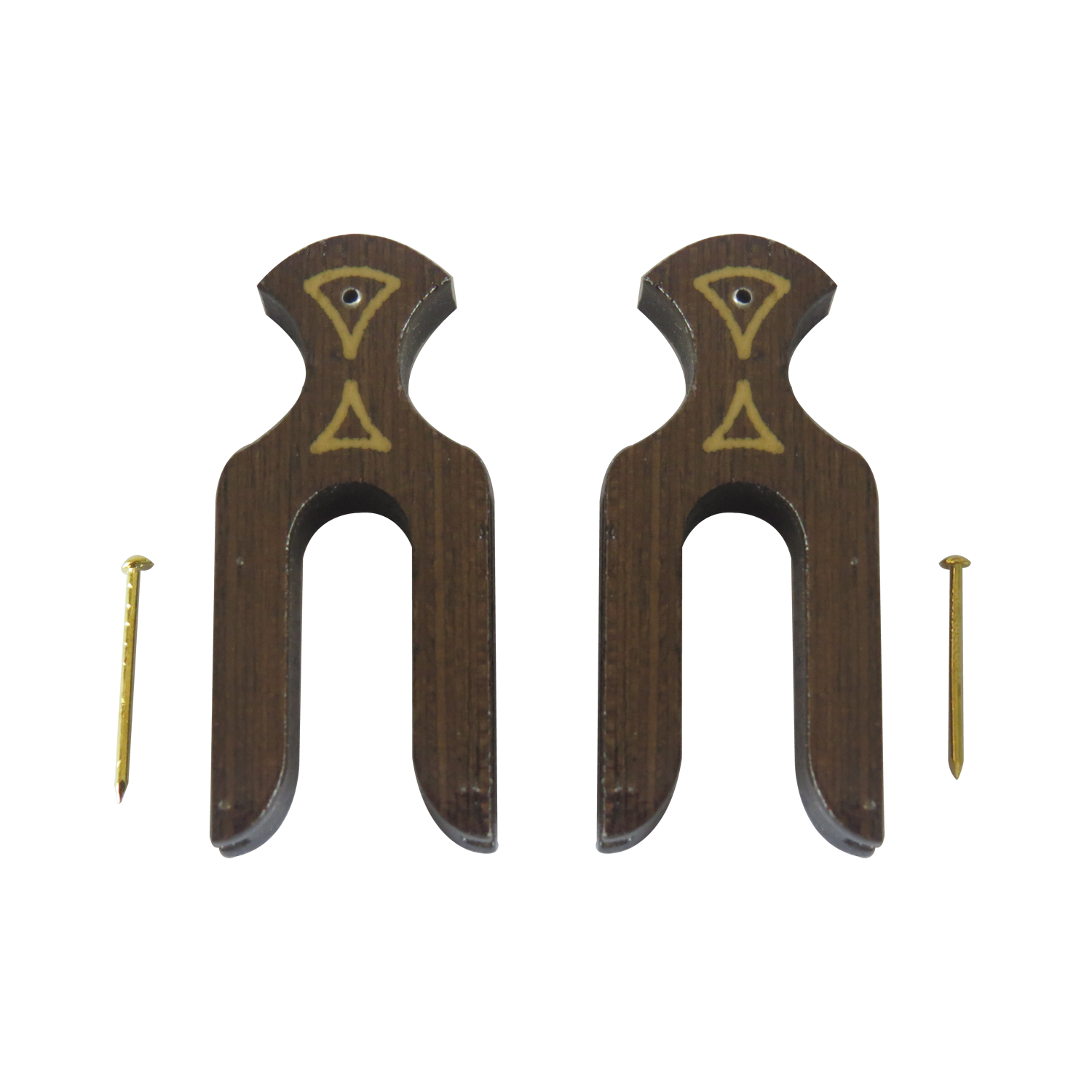 Par de presilhas na cor marrom, com prego para fixação de um poleiro. |