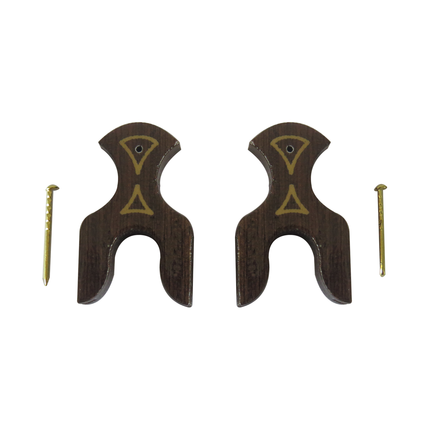 Par de presilhas na cor marrom, com prego para fixação de um poleiro. |