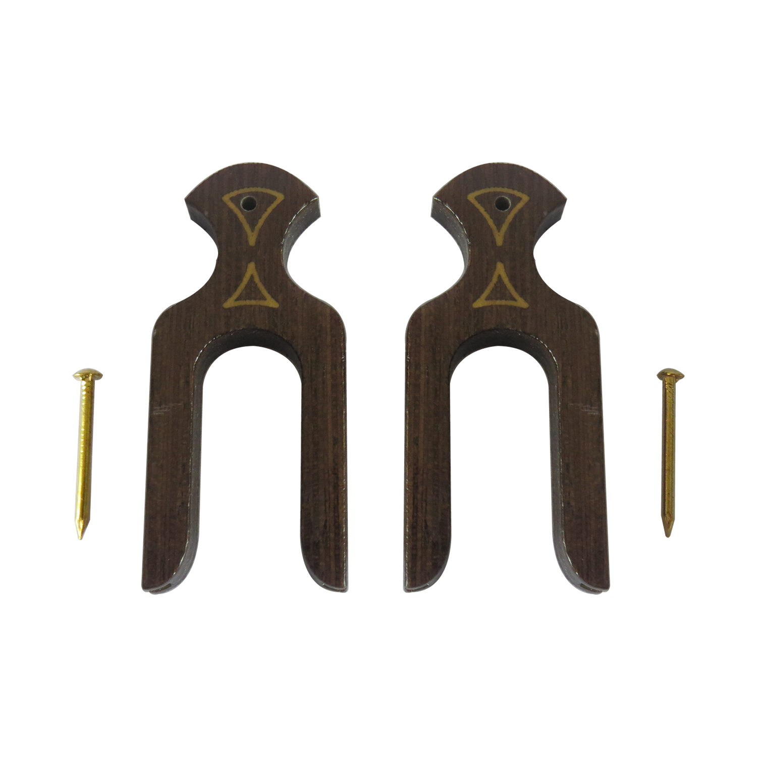 Par de presilhas na cor marrom, com prego para fixação de um poleiro. |