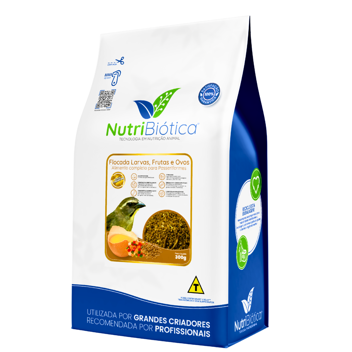 Indicação de Uso: A Nutribiótica Criador Profissional Trinca Ferro Flocada Larvas, Frutas e Ovos é um alimento completo e balanceado para passeriformes nas fases de manutenção e reprodução. Composição Básica: Milho Moído*, Quirera de Arroz, Farelo de Soja**, Farelo de Trigo, Grão de Aveia, Frutas Cristalizadas (2%), Ovo em pó (1%), Larva de Tenébrio Comum Desidratada (0,5%), Grão de Linhaça, Semente de Niger, Óleo de Soja Refinado**, Cloreto de sódio, Cloreto de Potássio, Prebióticos (Frutooligossacarídeo-FOS e Mananoligossacarídeo-MOS), Biomassa de microalgas (Schizochytrium sp.), Ácido Fólico, D-Pantotenato de Cálcio, Biotina, Vitamina C, Niacina, Cloreto de Colina, Vitamina A, Vitamina B1 (Tiamina), Vitamina B2 (Riboflavina), Vitamina B6 (Piridoxina), Vitamina B12, Vitamina D3, Vitamina E, Vitamina K3 (Menadiona), Inositol, Ferro Quelato, Cobre Quelato, Iodato de Cálcio, Sulfato de Cobalto, Sulfato de Manganês, Manganês Quelatado, Zinco Quelatado, Selênio Quelatado, Picolinato de Cromo, Dióxido de Titânio, Corante Amarelo Tartrazina, Corante Vermelho Ponceau 4R, Corante Azul Brilhante, Calcário Calcítico, Fosfato Bicálcico, Sorbato de Potássio, Cloreto de Potássio, BHA, BHT, Zeólita (0,5%), Aroma de Melaço, Aroma de Banana. Espécies doadoras de genes: * Streptomyces viridochromogenes, Bacillus thuringiensis. **Agrobacterium tumefaciens. Ingredientes fixos sem eventuais substitutivos. Níveis de Garantia:
