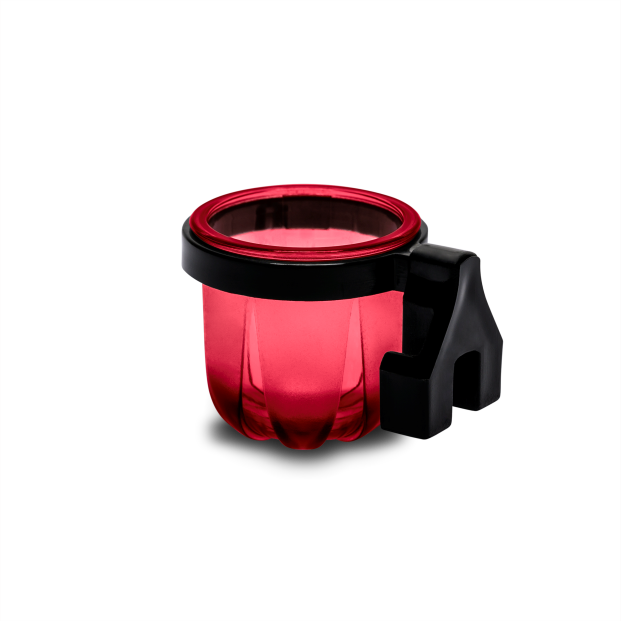 Porta Vitaminas Rubi pequeno vermelho com presilha preta.