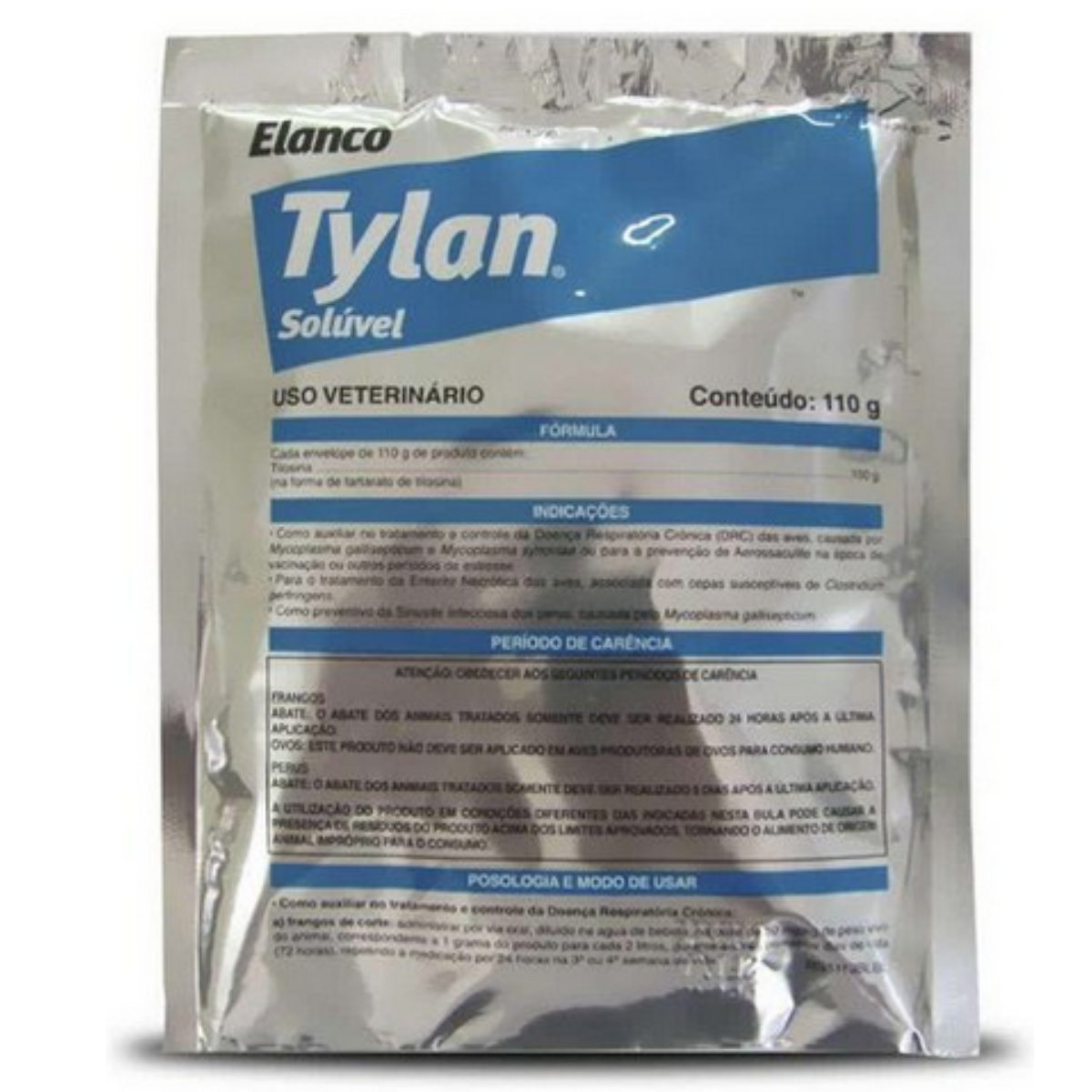 Tylan 110g Pó Solúvel auxilia no tratamento e controle da Doença Respiratória Crônica (DRC) das aves, na época de vacinação ou outros períodos de estresse, no tratamento da Enterite Necrótica das aves, associada com cepas susceptíveis de Clostridium perfringens e como preventivo da Sinusite Infecciosa das aves.