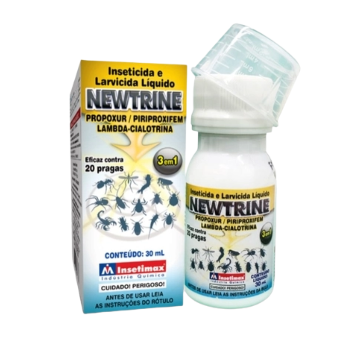 NEWTRINE é um produto larvicida elaborado com uma formulação exclusiva 3x1, à base de Suspensão de Encapsulado de Lambda-Cialotrina, Propoxur e Piriproxifen, para uso interno e externo. Controla 20 espécies de pragas e rende até 5 litros de calda. Pode ser usado em áreas internas e externas, com um pulverizador manual, aplicar nos locais de esconderijo dos insetos como frestas, cantos, rodapés, atrás de pias, bancadas, rachaduras, ao redor das portas, janelas e garagens. No controle de escorpiões e aranhas aplicar também nos locais escuros e úmidos, como pilhas de tijolos, ralos, caixa de gorduras, madeiras e entulhos. No controle de larvas de mosquitos, aplicar também em vasos de plantas, pneus, ralos, garrafas e locais onde possa haver acumulo de água parada. No controle de cupim e broca de madeira, aplicar também a calda inseticida com um pulverizador manual ou injetar nos orifícios com o auxílio de uma seringa. Para o controle de moscas e mosquitos, aplicar também em paredes, portas, janelas, cordões, varais, lixos e demais superfícies em que estes insetos possam pousar e também em locais onde eles possam se alojar ou proliferar.