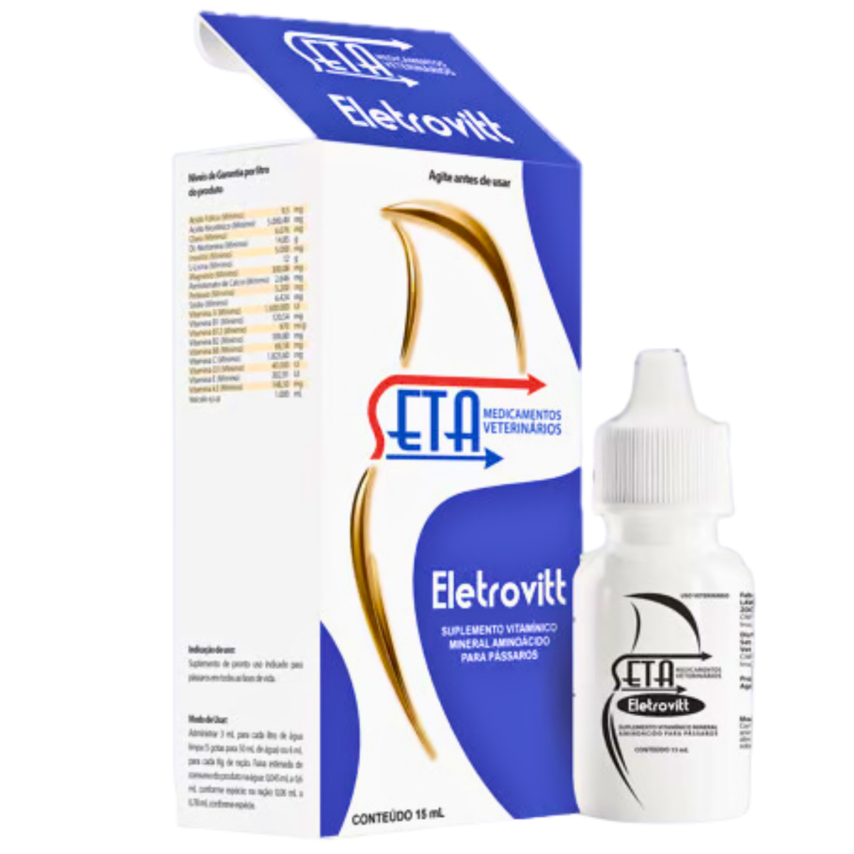 SETA ELETROVITT Suplemento Vitamínico Mineral Aminoácido para Pássaros em Todas as Fases da Vida Indicação do Produto: Contém 33 nutrientes, incluindo extrato de guaraná, conhecido por suas propriedades energéticas. Além do complexo vitamínico ADE e sacarose, essencial aos pássaros como fonte de energia e vitalidade. Contém eletrólitos e vitaminas, além de metionina e lisina. Indicado para pássaros em todas as fases de vida, especialmente formulado para corrigir eletrólitos perdidos durante o processo de desidratação. Auxilia na diminuição da mortalidade e desuniformidade de lote, na produtividade e conversão alimentar. Fornece um reforço energético essencial e de fácil assimilação, aumentando a resistência orgânica para viagens longas, vacinação e mudanças bruscas de temperatura. Posologia – Modo de Uso:
