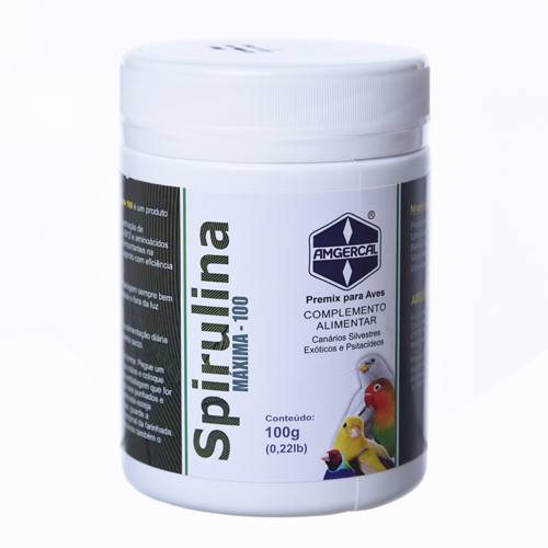 Spirulina Spirulina 100 é produto natural (a base de algas) desidratado e irradiado, que possui em sua fórmula alta concentração de Proteínas, Vitamina E, Betacaroteno, Vitamina B12 e aminoácidos essenciais que em conjunto assumem funções importantes na formação de anticorpos, na imunidade da ave agindo com eficiência no período reprodutivo. Modo de usar: