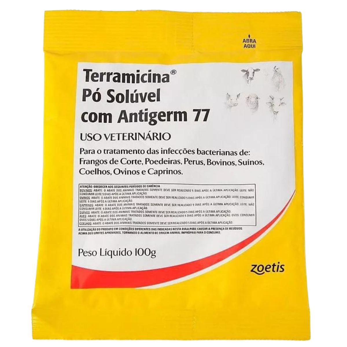 Indicações: Terramicina® Pó Solúvel com Antigerm 77 é indicada para o tratamento de diarréias (cursos) enterites cólera aviária tifo aviário pulorose doenças respiratórias (pneumonia bronquite coriza infecciosa) em bovinos ovinos caprinos suínos aves e coelhos. Dosagem: As dosagens podem ser modificadas a critério do médico veterinário. Não interromper o tratamento antes de 5 dias mesmo que antes disso haja desaparecimento dos sintomas. A água medicada deve ser fornecida em abundância para todos os animais em tratamento durante 24 horas por dia. Nenhuma outra fonte de água que não a medicada deve ficar disponível durante todo o período de tratamento.